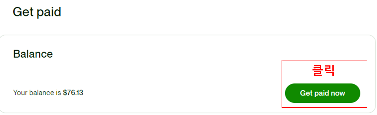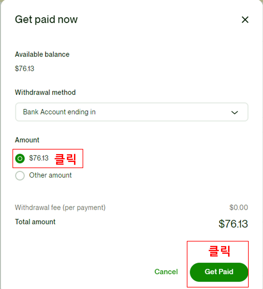 돈을 입금발들 은행계좌를 체크하고, 원하는 이체금액을 체크하고 Get Paid를 체크합니다.