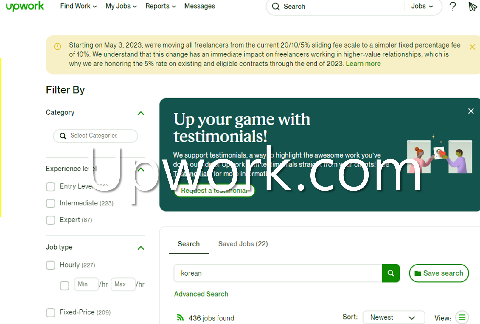 업워크는 그동안 돈을 많이 안 버는 프리랜서비에서 서비스 수수료를 20 퍼센트를 떼갔습니다. 5월부터는 10퍼센트로 줄어들기는 합니다.