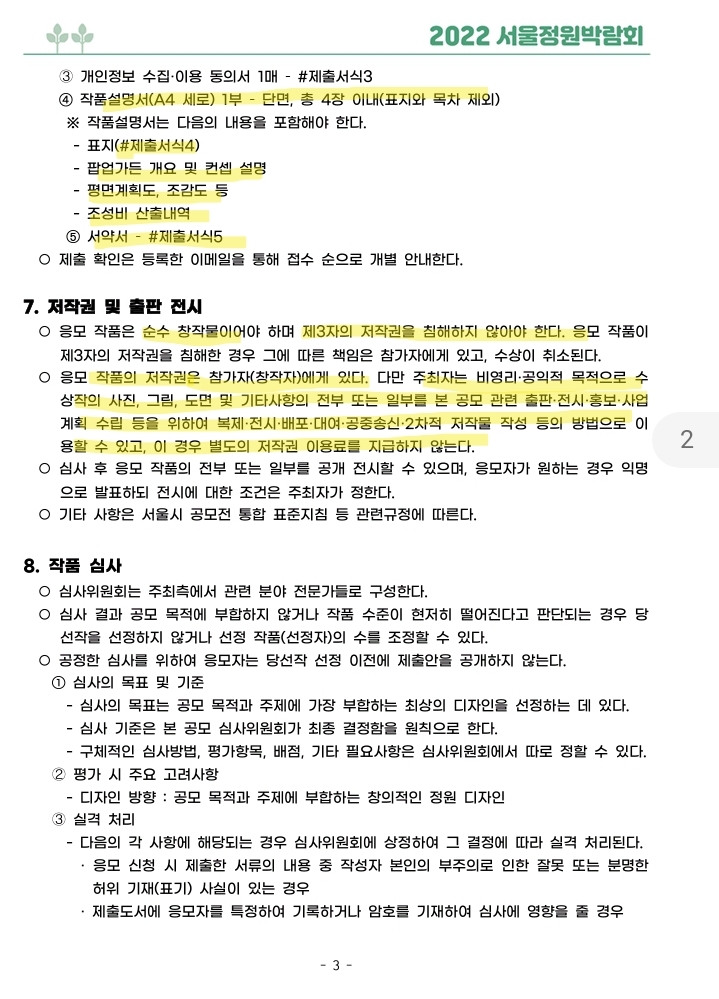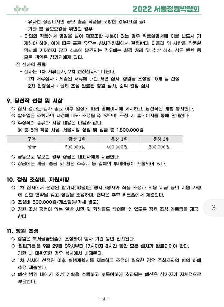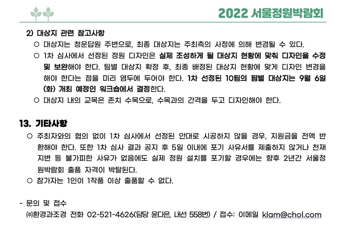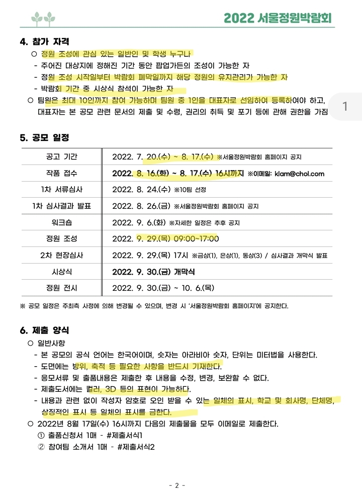 참가 신청은 7월 중순, 작품 접수는 8월 중순, 1차 발표는 8월 말, 워크숍은 9월 초, 정원조성은 9월 말로 일정이 정해졌었다.