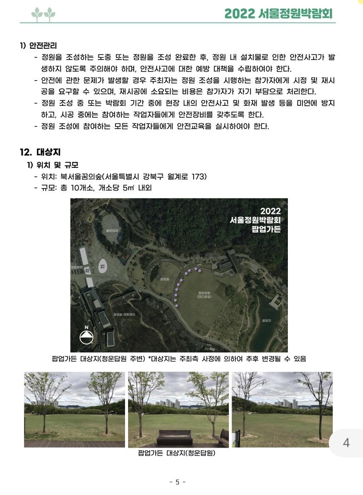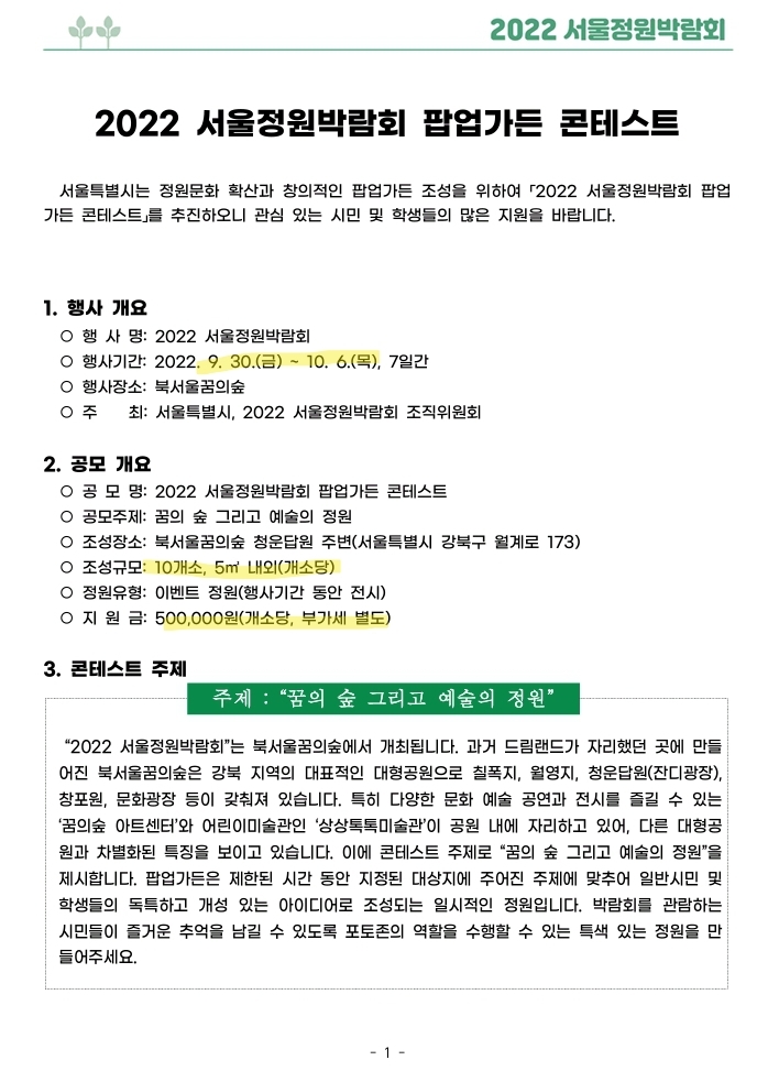 서울시는 매년 장소를 바꾸어가며 서울정원박람회를 개최한다. 부대행사 중 학생이 참여할 수 있는 팝업가든 콘테스트가 열린다.