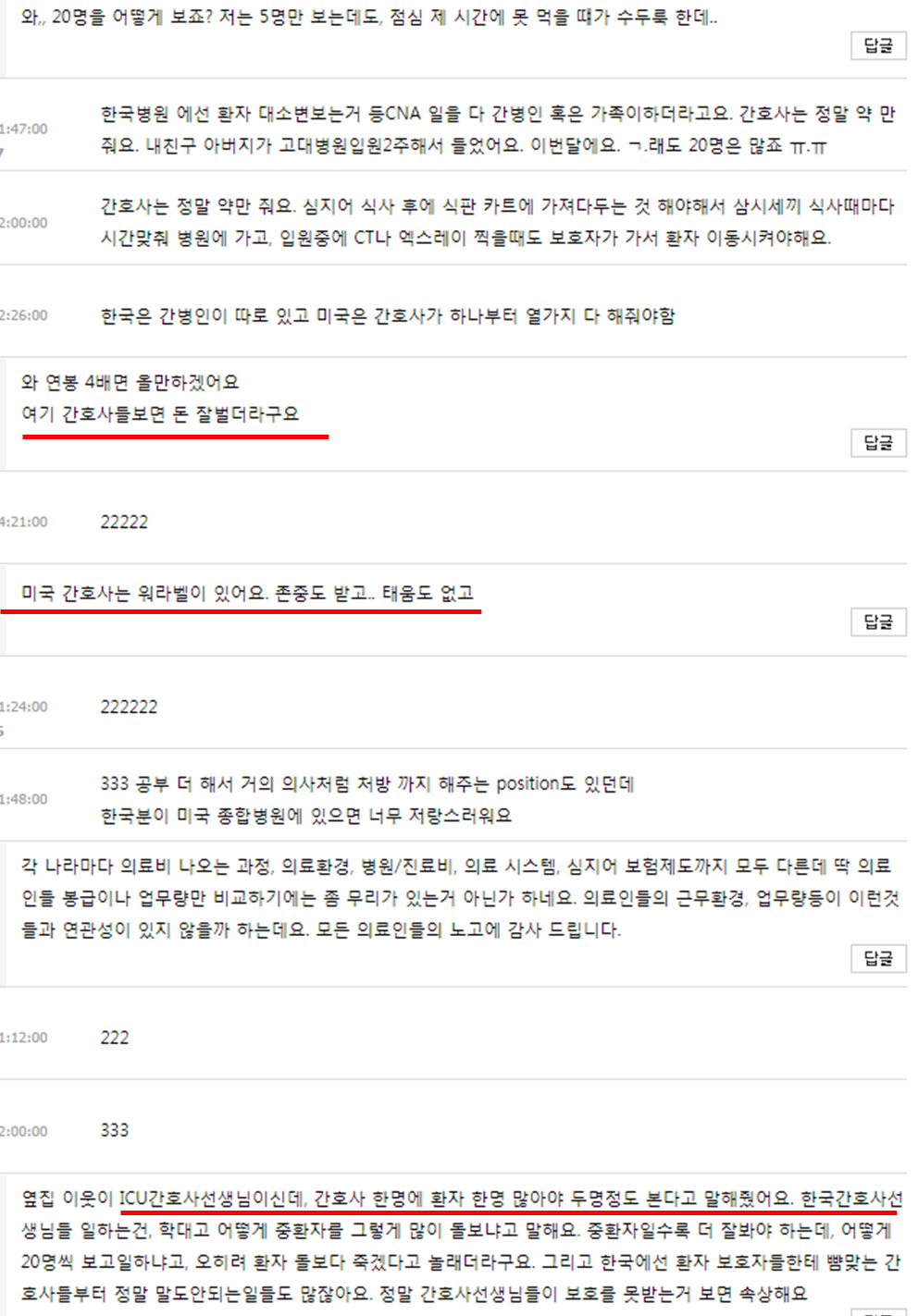 한국이고 미국이고 간호사 일은 힘들지만, 미국 간호사가 더 존중받는 직업이어서 훨씬 낫다는 의견이 있습니다.