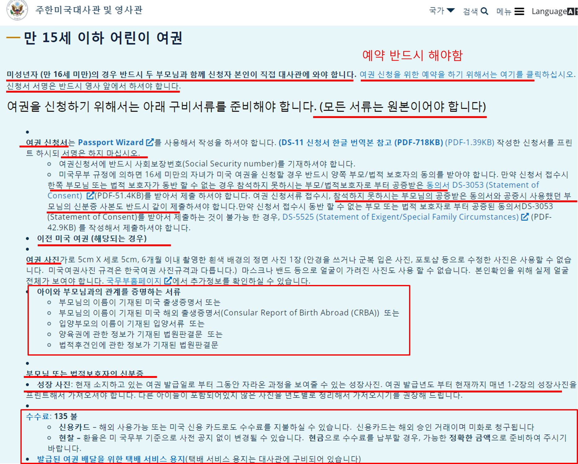 주한 미국대사관은 미성년자 (만 16세 미만)의 여권을 신청할 경우 자녀뿐만 아니라 반드시 두 부모님과 함께 신청자 본인이 직접 대사관에 와야 한다고 안내합니다.