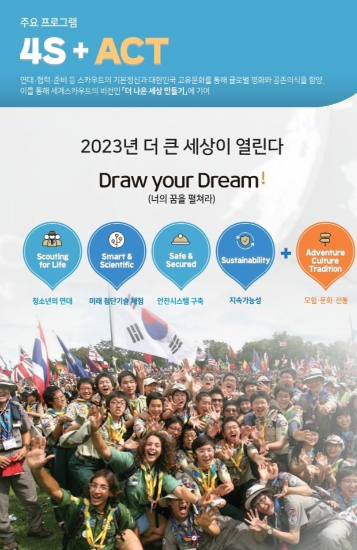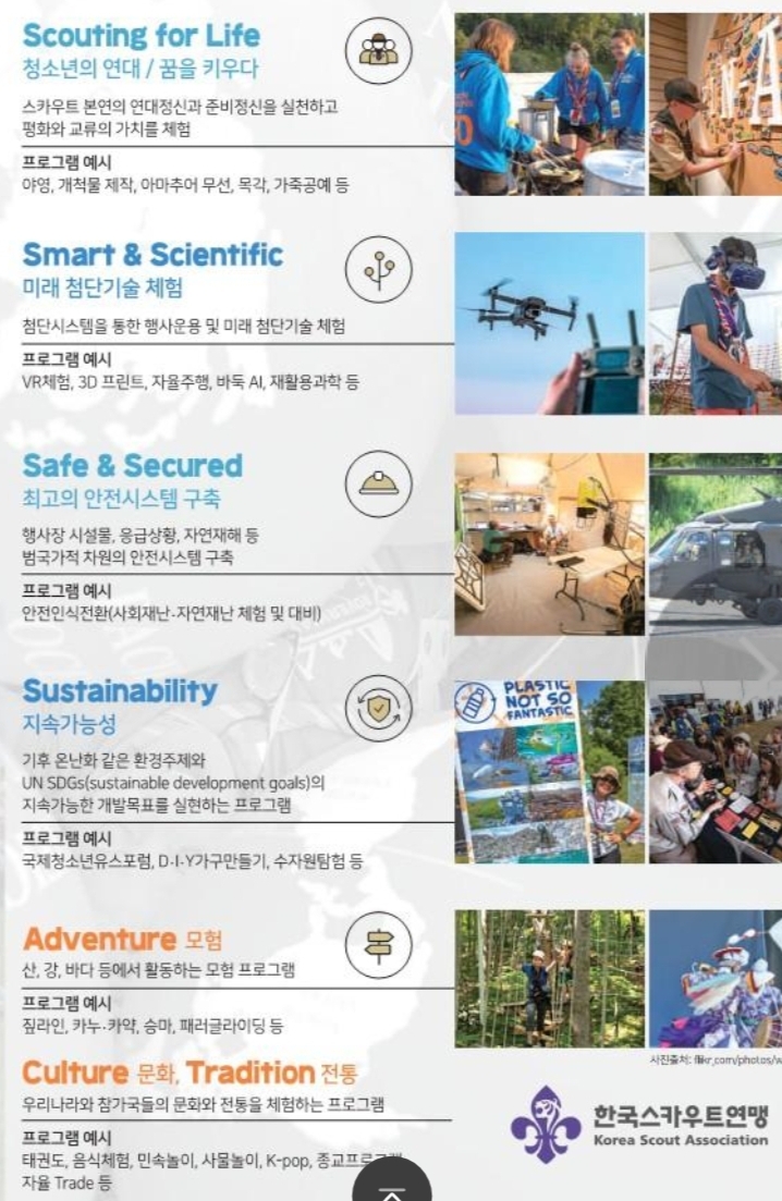리더는 편한 곳에서 호위호식하고 전우 상황을 진심 진정으로 체험하지 않는 한국의 분위기는 여전하다. 졸속행정과 준비부족의 국민성이 좀 나아졌나 싶었는데 역시 아닌 게 여기서 드러났다. 이하 사진들은 새만금 세계 잼보리 홍보 브로셔에서 가져온 이미지이다. 홍보물과 실제 스카우트 행사장의 괴리를 잘 생각해보자.