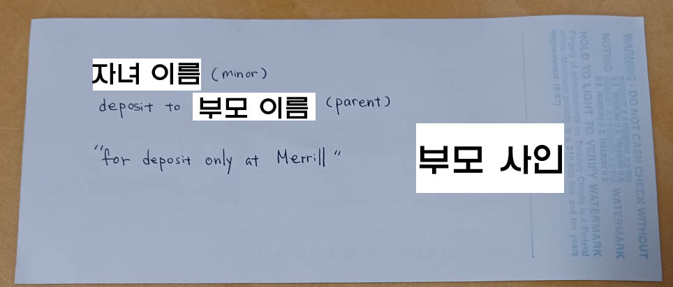 체크 수신사 명과 은행 예금자명이 같은 경우, 수표 뒷면에 "for deposit only at Bank of America" 쓰고 본인 사인만 하면 된다.