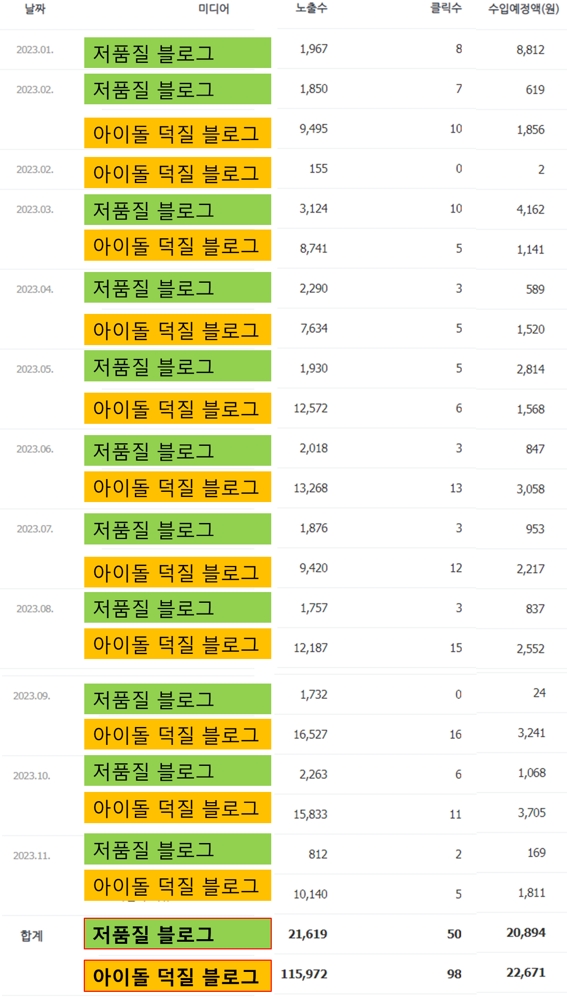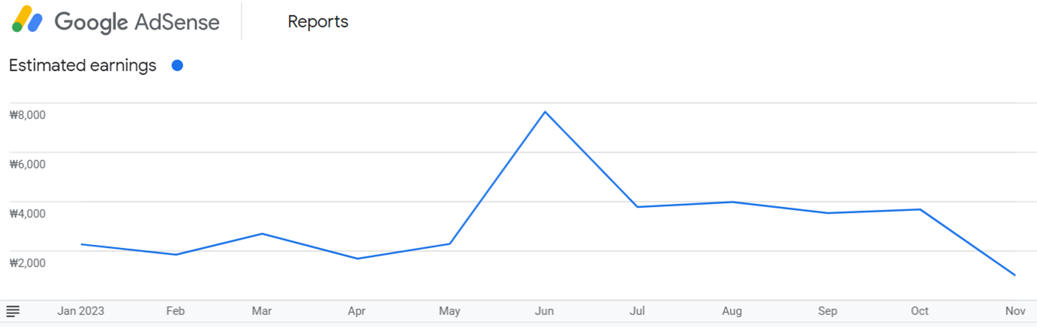 2023년 1월부터 11월 중순까지 저품질 블로그에는 20,800원 정도, 아이돌 덕질 및 식당 리뷰 블로그에는 22,600원 정도의 네이버 애드포스트 광고 수입이 생겼습니다.