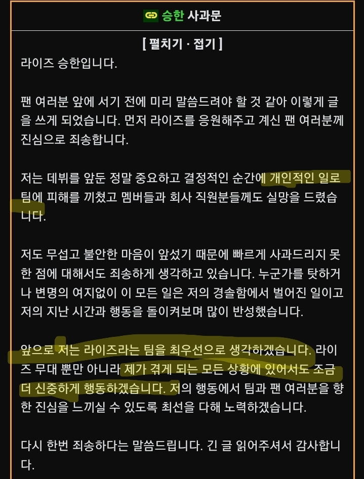 예전 슈퍼주니어 강인이 계속 사생활 문제를 일으켜도 팀에서 계속 안고 가다가 결국 팀에서 탈퇴한 경우를 보면 과거에 문제 있던 사람을 바꾸는 것은 힘들고, 설사 지금은 괜찮아 보여도 결국 미래에 물의를 일으킬 가능성이 있지 않을까 의심이 스멀스멀 듭니다.