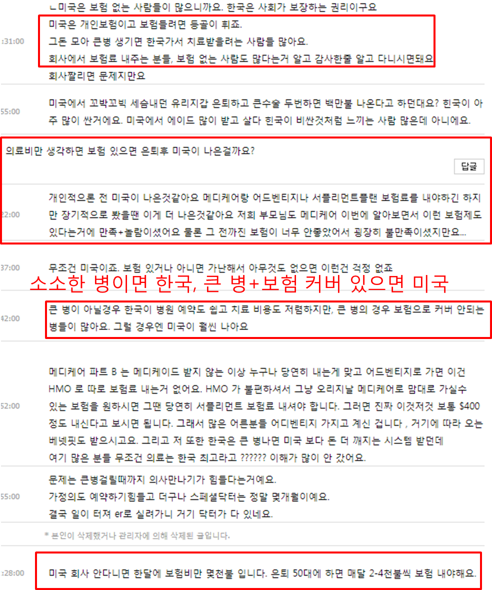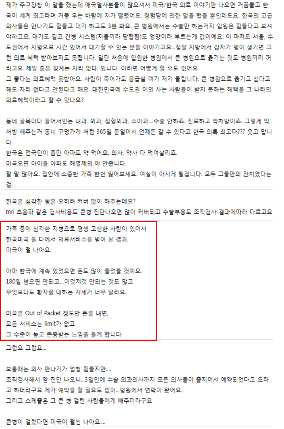 아래 글에서는 작고 소소한 병이면 한국 의료 시스템이, 심각한 병이고 미국에 좋은 보험에 가입된 상태면 미국 병원 시스템이 비용적으로 환자에게 이득이라는 의견이 많습니다.