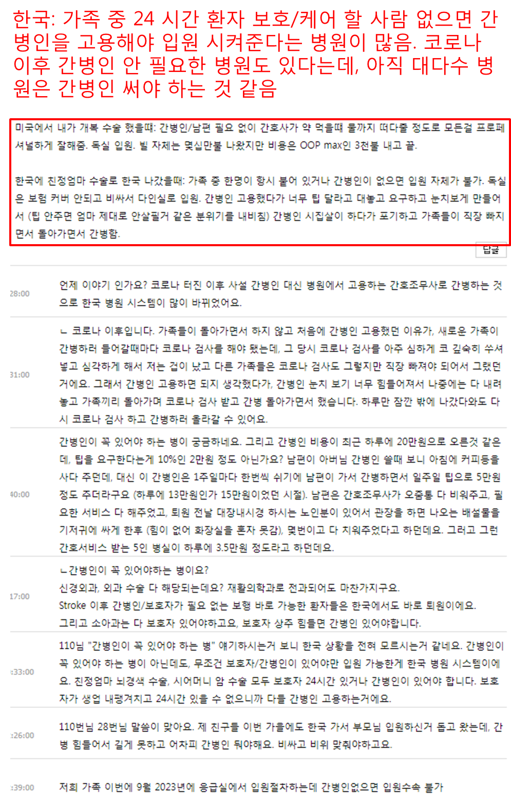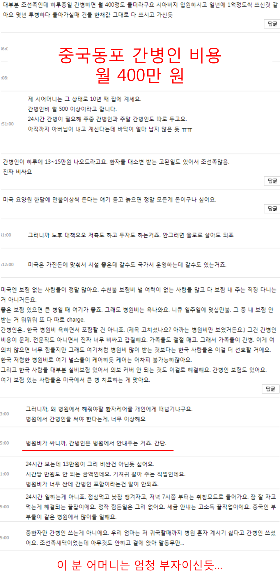 다음은 미씨usa에 올라온 한국과 미국의 의료비에 대한 토론을 스크랩한 내용입니다. 아래 글은 특히 한국의 간병인 제도에 대한 의견 및 체험담이 많이 있습니다.
