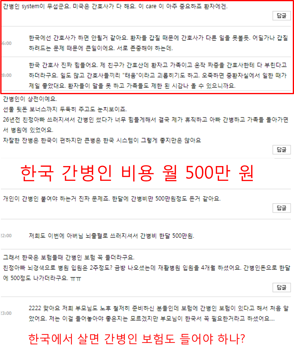 하지만 이런 간병 관련 서비스가 의료비로 책정이 되지 않아서 한국의 의료비가 낮다고 추측을 합니다. 또한 한국의 환자들이 간호사들에게 갑질을 너무 많이 해서 간호사가 미국식으로 환자를 케어하는 것을 원하지는 않는 것 같습니다.