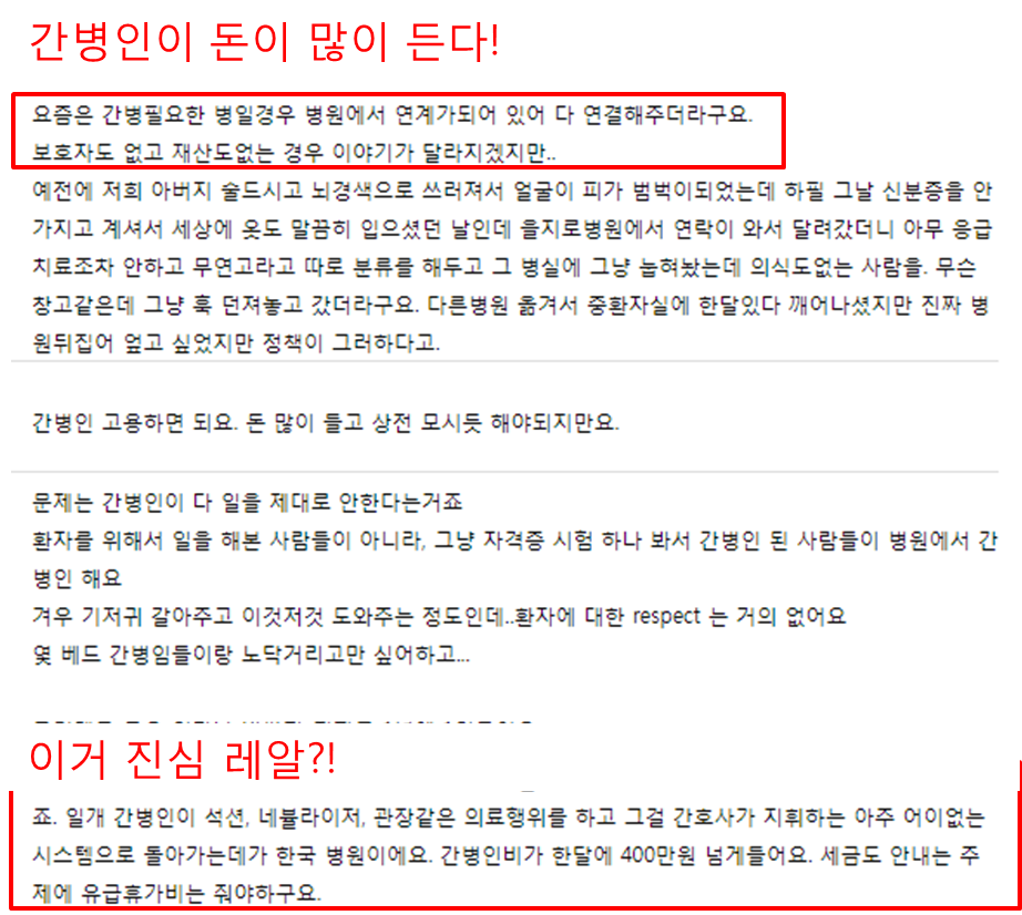한국의 병원에서 많은 의료 관련 행위가 간호사가 행하지 않아 간병인이 해야 하는데, 이들에 대한 보수는 일종의 캐시딜이여서 환자 및 환자 가족에서 부담이 많이 된다는 의견이 많습니다.