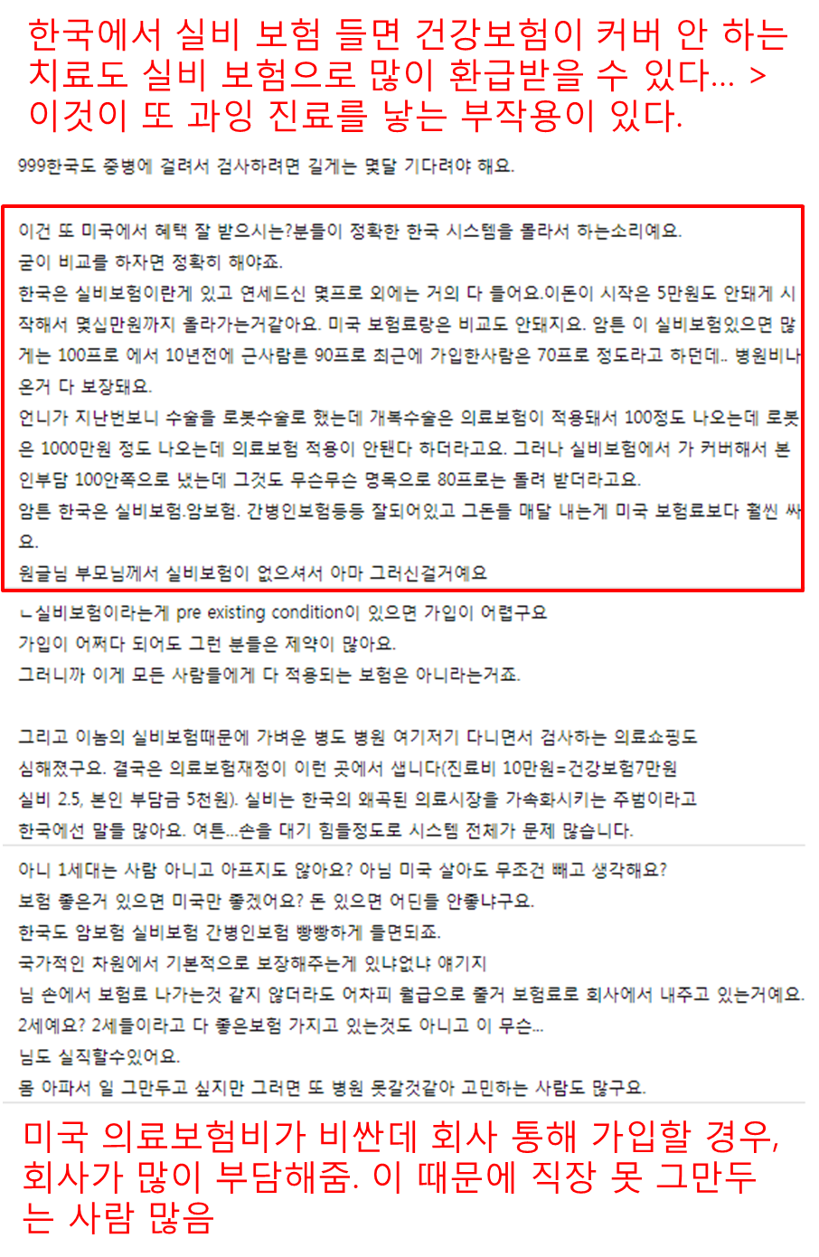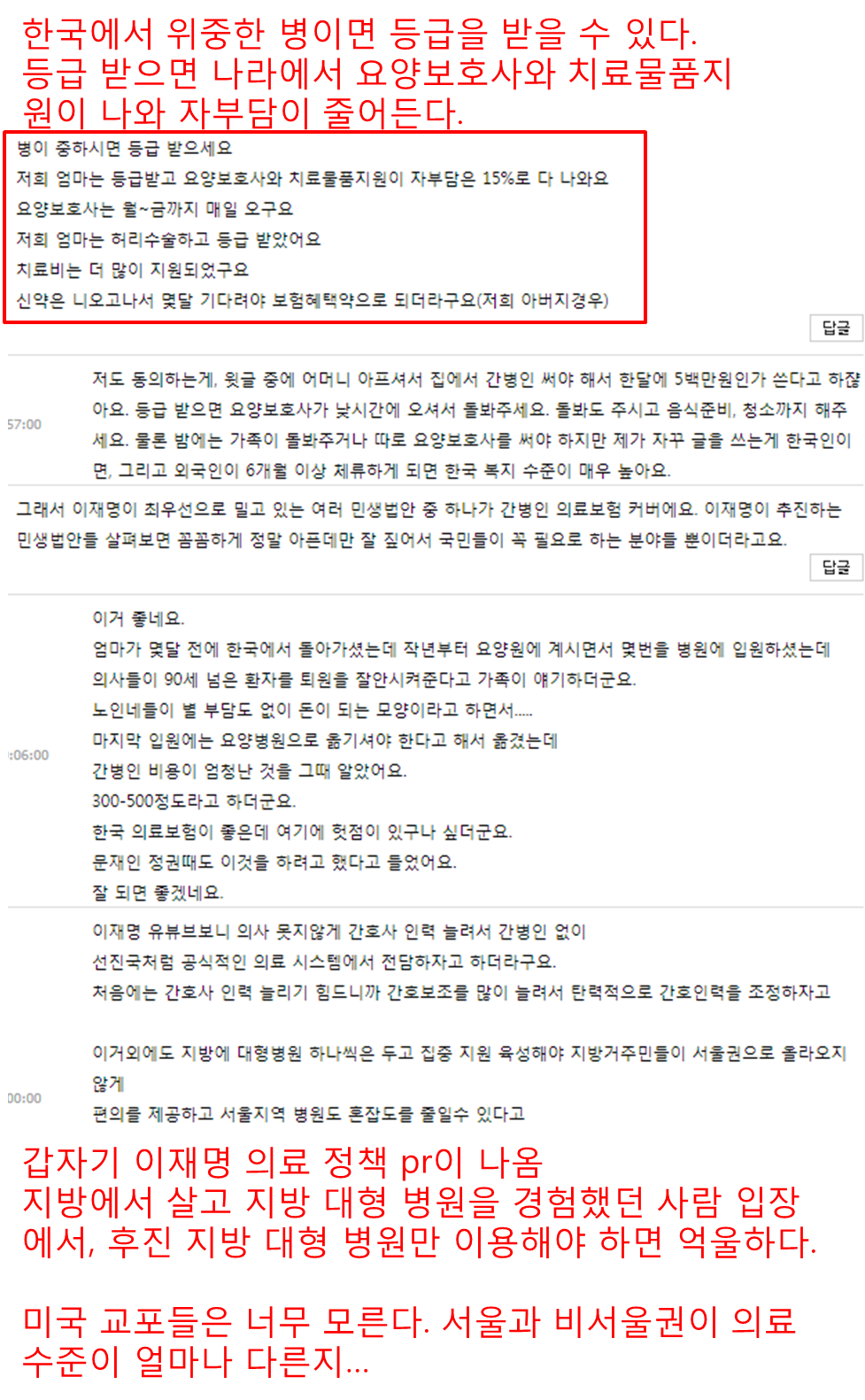 미국 교포들이 하는 논쟁 중 하나는 한국과 미국의 의료 서비스 및 의료비입니다. 한국인들의 미국 이민 사회가 정착하면서 미국 보통 회사에 W2 워커로 일하는 사람들은 직장을 통해 의료보험에 가입합니다. 직장 의료보험이 있을 경우, 많은 질병이 보험에서 커버해 주는 시스템입니다. 반면 한국 건강보험이 커버하는 질병이나 치료법에 한계가 있고, 간병인이나 24시간 케어를 해줄 보호자가 없으면 입원을 거부하는 병원이 많아서 미국에서 치료받는 것이 더 낫다고 주장하는 사람들도 있습니다. 이에 한국에서 미리미리 실비보험이나 간병인 보험에 가입해서 한국의 의료비를 높이는 간병인 고용비와 치료에 대비하는 것을 추천합니다. 또한 한국에서 중한 병인 경우, 등급을 받으면 요양보호사와 치료물품 지원이 나와서 개인의 의료비 부담을 줄일 수 있다고 합니다.