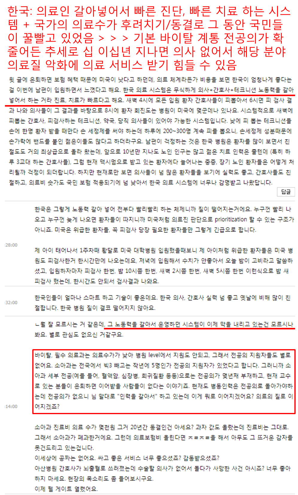 미국 교포들은 한국과 미국의 의료 서비스를 비교할 때가 종종 있습니다. 한국 병원 옹호론자들은 한국 병원이 바로 병의 진단과 치료가 빠르고 의료비 또한 싸다며 칭찬합니다. 하지만 이는 몇 십 년째 동결된 의료 수가 때문이고, 인력을 갈아서 만드는 빨리빨리 문화 때문에 가능한 것입니다. 결론적으로 의대생들이 제대로 돈을 받지 못하는 소아과, 산부인과, 내과 등 기본적인 의대 세부 전공을 기피하는 현상이 이루어진지 꽤 되었습니다. 이런 바이탈 분야의 의사가 배출되지 않으면 몇 십 년 후에는 해당 분야 의료 서비스를 받기 힘들어질 수 있습니다.