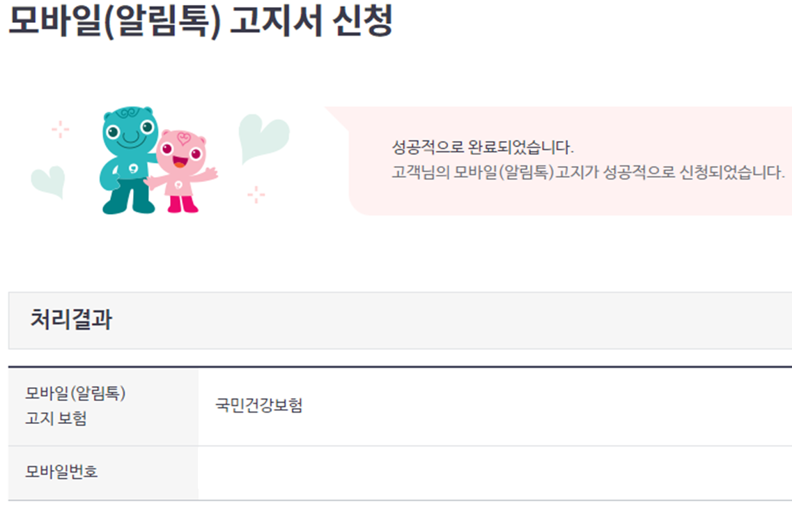그러면 모바일 고지가 신청 완료되었다는 처리결과가 뜹니다.