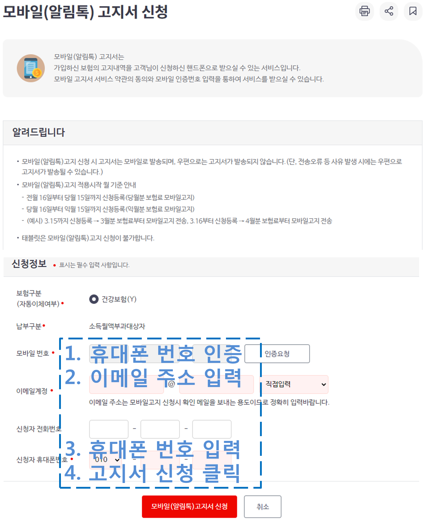 휴대폰 번호 인증 후, 이메일 주소와 휴대폰 번호를 입력하고 '모바일(알림톡) 고지서 신청'을 클릭합니다.