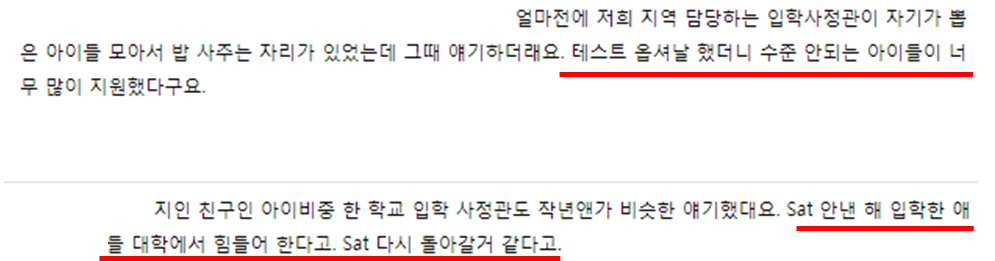 물론 미국 대학교 입시 사정관은 지원자 학생의 학교명을 볼 수 있기 때문에 한국 대학 입시와는 다른 입장일 것입니다.