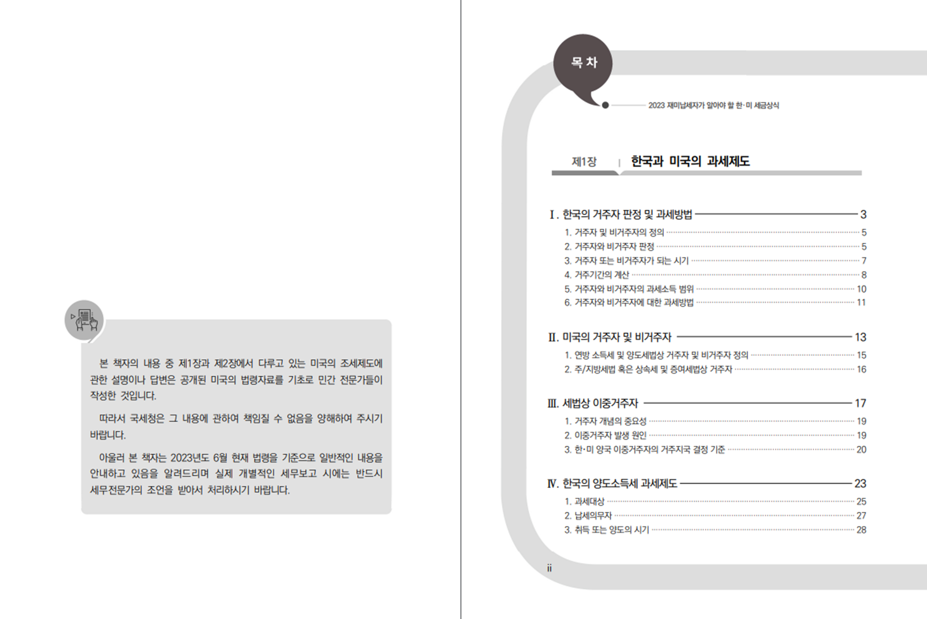 한국 납세자면서 미국 납세자가 많은 상황을 고려해서 국세청에서는 작년에 <2023 재미 납세자가 알아야 할 한미 세금상식>이라는 책자를 발간했습니다. 이 책은 미국 시민권자 또는 영주권자, 또는 미국 거주자가 한국에 내야 하는 세금 정보뿐만 아니라 이들이 신경 써야 하는 미국 세금 정보 또한 한국어로 설명되어 있어서 한국 미국 세금을 다 알아볼 수 있는 장점이 있습니다.