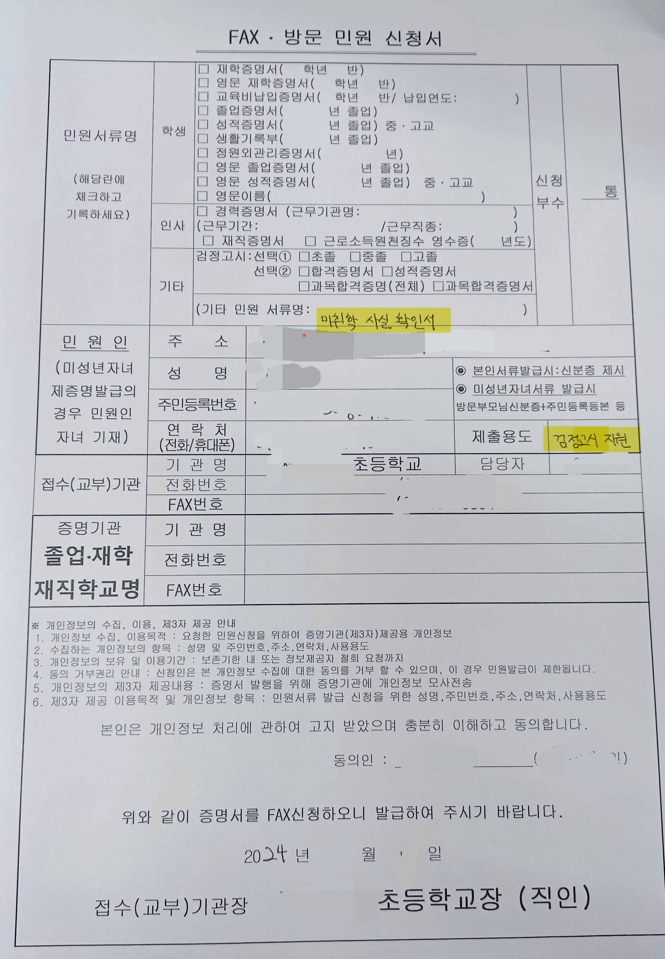 학교 행정실에 갔더니, 미취학 사실 확인서 수령을 위해서 민원 신청서를 써달라고 해서 썼습니다.