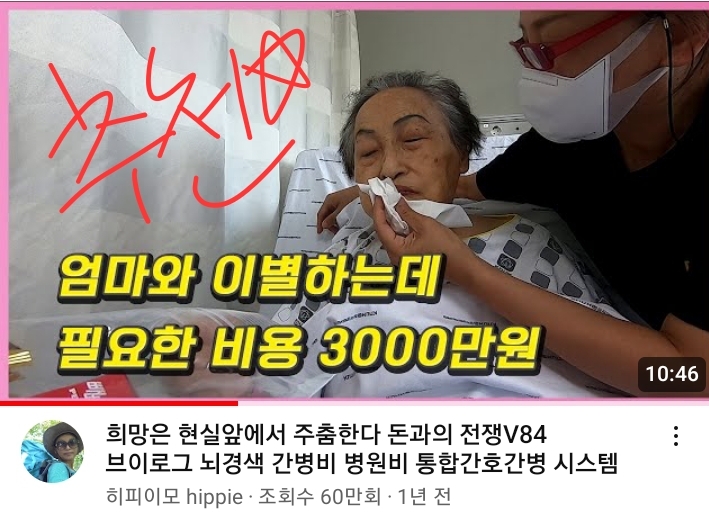 이 영상을 보기를 강력하게 추천한다.주변에 노인 모시고 간병하는 이야기는 많이 들었지만, 이렇게 비용적인 측면을 자세하게 팩폭하는 영상을 처음 보았다.히피이모가 히피할매(엄마)와 여행도 잘 다녔고, 히피할매도 쓰러지기 직전까지 너무 정정했었다.이게 내 부모에게도 일어날 수 있고, 내가 노년 때 겪을 수도 있다.지금 애들 학교 일년 등록금이 일년에 삼천 오백만 정도이다.이 돈도 너무 버겁다.근데 할머니가 쓰러지니 두달도 안 되는 사이에 삼천만 정도 의료 비용이 발생했다고 한다.나도 혹시 나에게 무슨 일이 생기면 집안에 폐를 끼치지 않기 위해 민간 보험에 가입하기로 결정했다.내가 어릴 때 반 사기꾼 같은 보험설계사를 많이 만났었다. 그래서 보험설계사를 안 거치고 보험다모아에서 상품들을 보고 스스로 선택해서 인터넷으로 보험 가입을 하려고 했는데 문제가 발생했다. 내가 현재 한국에서 F 4 동포비자로 살고 있는 외국인이어서 인터넷에서 손쉽게 가입하는 민간보험을 들기 힘든 것이었다. 그래서 결국 가족의 보험을 케어해주는 분을 만나서 두달 간 엄청 이야기를 한 결과, 실손보험 하나, 건강보험 하나, 뇌심장질환 진단비 커버되는 보험 하나에 가입했다. 나는 월 5만 원 정도를 보험으로 지출하려고 했는데, 결국 8만 원에 가까운 돈이 매달 나가게 되었다. 건강보험의 경우, 100세 종신으로 가입기간을 설정했다. 내 주변 할머니 할아버지는 90세 이후 갑자기 상태가 안 좋아지셔서 그때부터 병원비가 많이 들었을 것 같았기 때문이다. 그럼 앞으로 20년간 보험료 납부를 잘 하겠다.