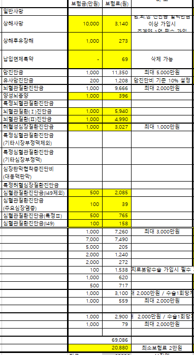 보험 설계사가 보험은 최소 2만 원 넘어야 가입 가능하다고 하며, 뇌와 심혈관 관련 진단금 범위를 엄청 넓게 잡았습니다.