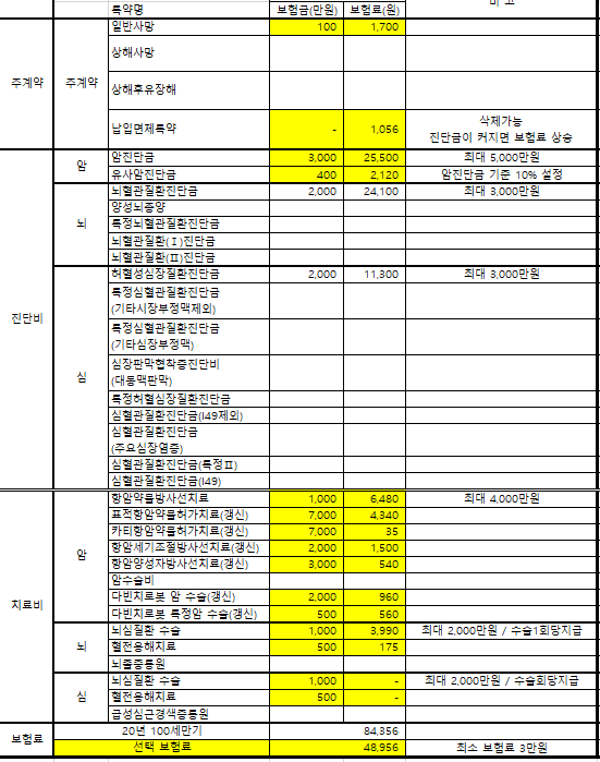 아래 표에서 노란색으로 표시된 부분만 선택해서 보험을 체결했습니다.