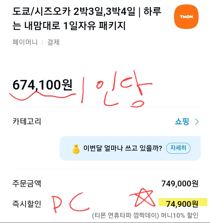항공권, 호텔, 가이드 버스 등을 포함한 가격은 노랑풍선 웹사이트에서는 인당 80만 원 중반이었으나, 저는 티몬을 통해 인당 67만 원대에 결재했습니다.