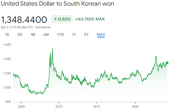 위 그래프에서 흥미로운 점은 2000년대 말 경제 위기를 세게 맞은 나라는 미국이면(리만 브라더스 대침체) 달러 가격이 폭망할 것 같은데, 오히려 원화 기준으로는 달러 가격이 엄청 비싸졌습니다.