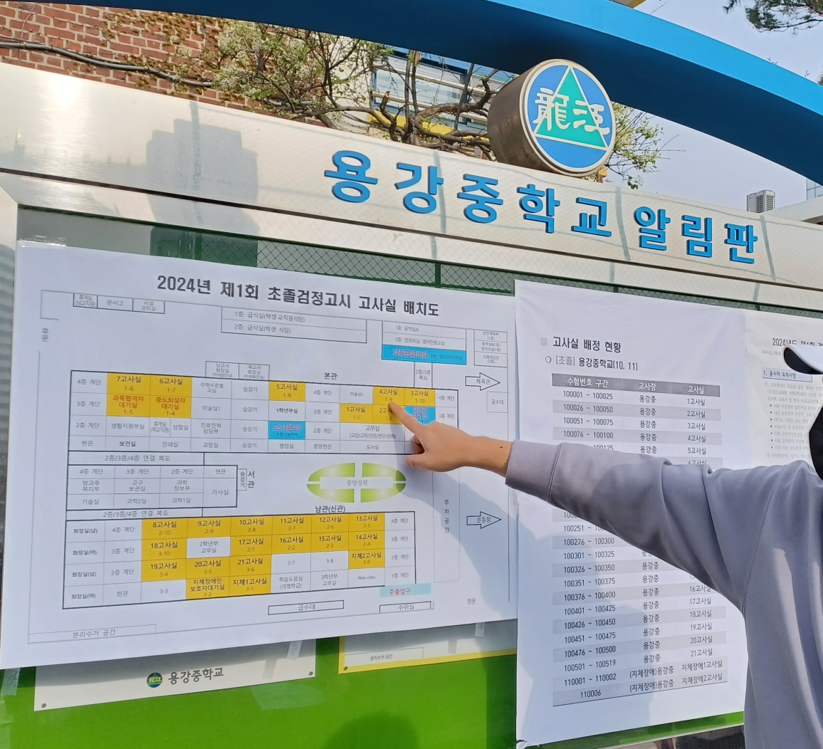 어제 아이가 서울시 초등학교 졸업 검정고시를 쳐서 바래다준 후기를 쓰겠습니다. 오전 8시 40분까지 입실 완료를 해야한다고 해서 음료수, 아이 수험표, 신분증을 가지고 오전 8시 30분경에 용강중학교에 도착했습니다. 주차장이 없다고 하더니만 운동장을 주차장으로 쓰고 있어서 수많은 부모님들이 자가용으로 자녀를 용강중에 데려온 것 같았습니다. 학교 교문 바로 지나서 게시판에 학교 고사장 배치도와 수험번호 별 배정 고사실이 게시되에 있었슥니다. 학부모는 학생들을 데리고 고사장 안까지 들어갈 수 있었습니다. 학교 건물 내외로 고사실 안내가 붙어있어서 고사장을 찾기 쉬웠습니다. 아이 자리까지 확인해서 앉히는 순간 방송으로 8시 40분 전어 학부모들은 모두 학교 밖으로 나가야 한다는 방송이 나와서 얼른 밖으로 나왔습니다. 모든 시험 끝나는 시간인 11시 40분에 시간 맞춰서 용강중학교에 가니 이미 부모님들로 인산인해를 이루었습니다. 시험은 11시 40분에 끝났으나, 실제 수험생들은 11시 55분쯤 되서야 밖으로 나왔습니다.