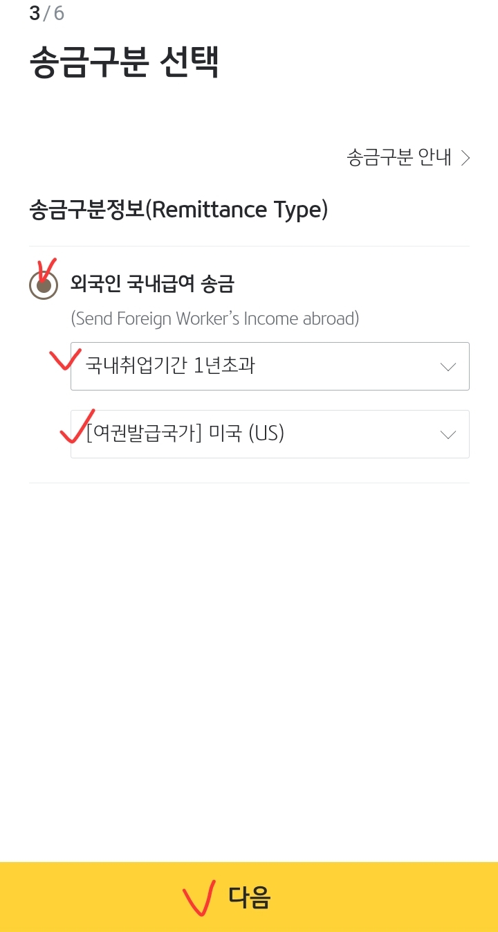 외국인국내급여 송금을 체크하고 다음을 누릅니다