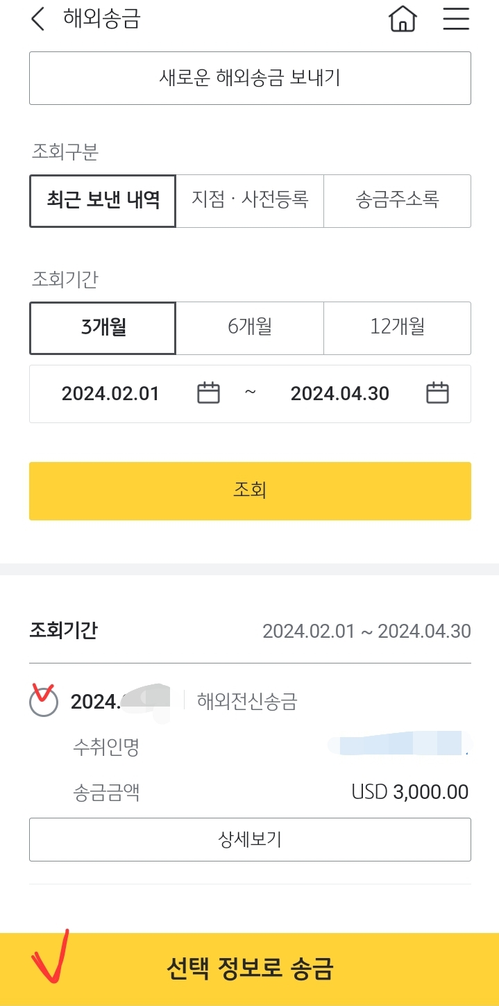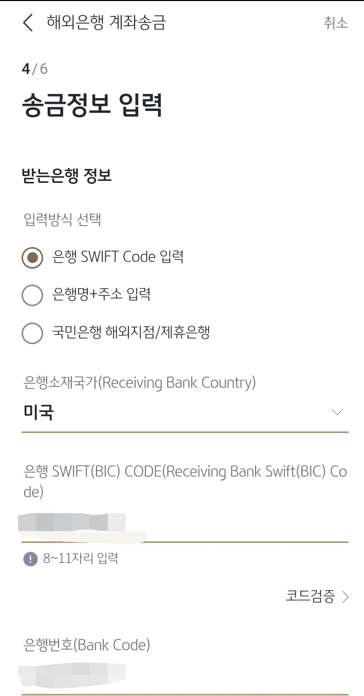 과거에 송금 보냈던 제 계좌정보가 뜹니다. 여기서 미국은행 스위프트 코드검증을 해야 진행이 됩니다.