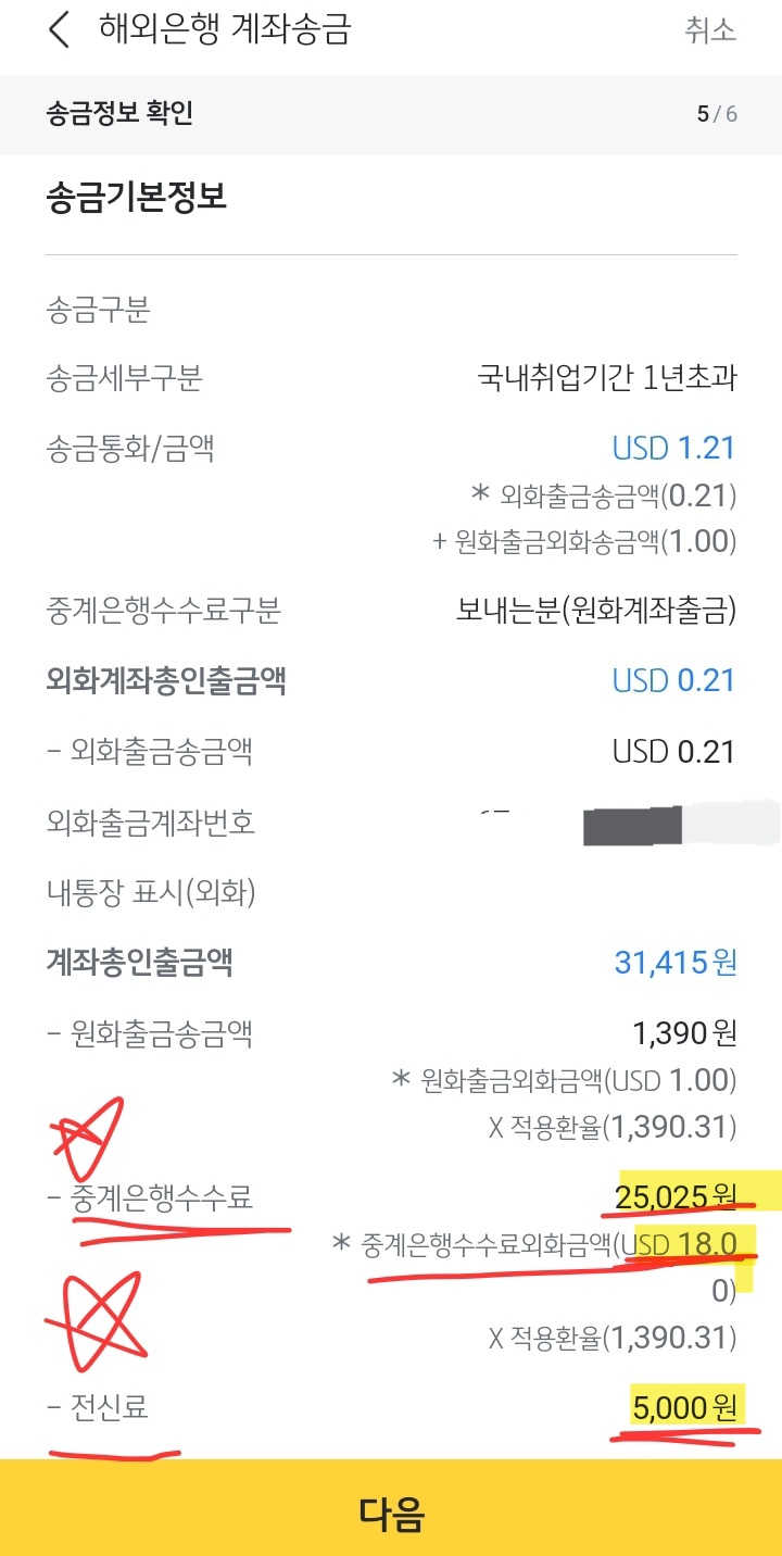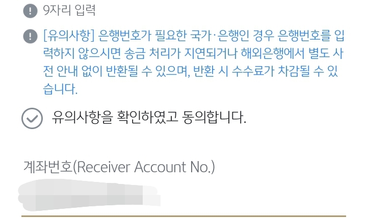 저는 모바일로 송금 시 1회 최대 송금한도가 5000불입니다. 여기에 중계은행수수료가 18불이 붙고, 전신료는 5000원이 붙습니다. 그래서 현재 환율로는 5000불까지 송금 시 수수료 합이 3만 원 조금 넘습니다. 이렇게 한 후 opt 비밀번호를 누르는 등 계좌이체를 진행하듯 진행하면 송금이 신청완료됩니다. 요즘은 하루 정도면 송금이 완료됩니다.