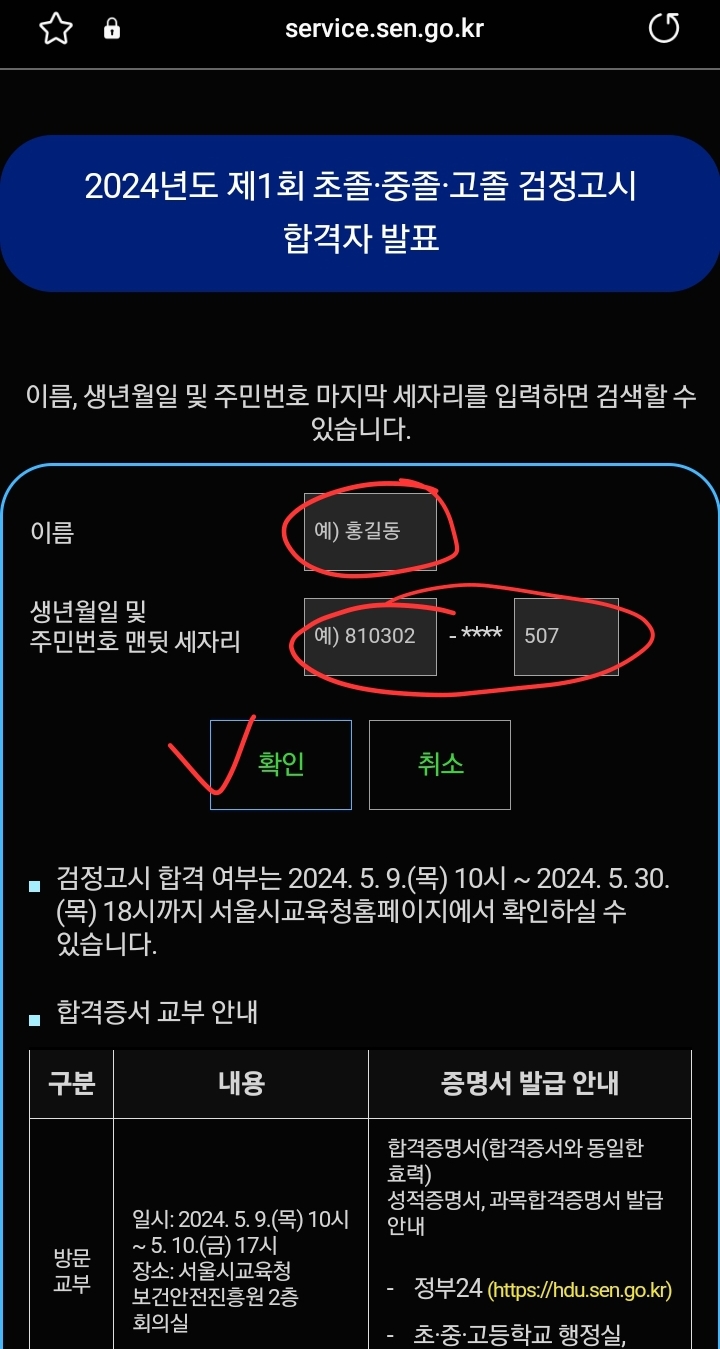 2024년도 제1회 초졸·중졸·고졸 검정고시 합격자 발표 이름, 생년월일 및 주민번호 마지막 세자리를 입력하면 검색할 수 있습니다.