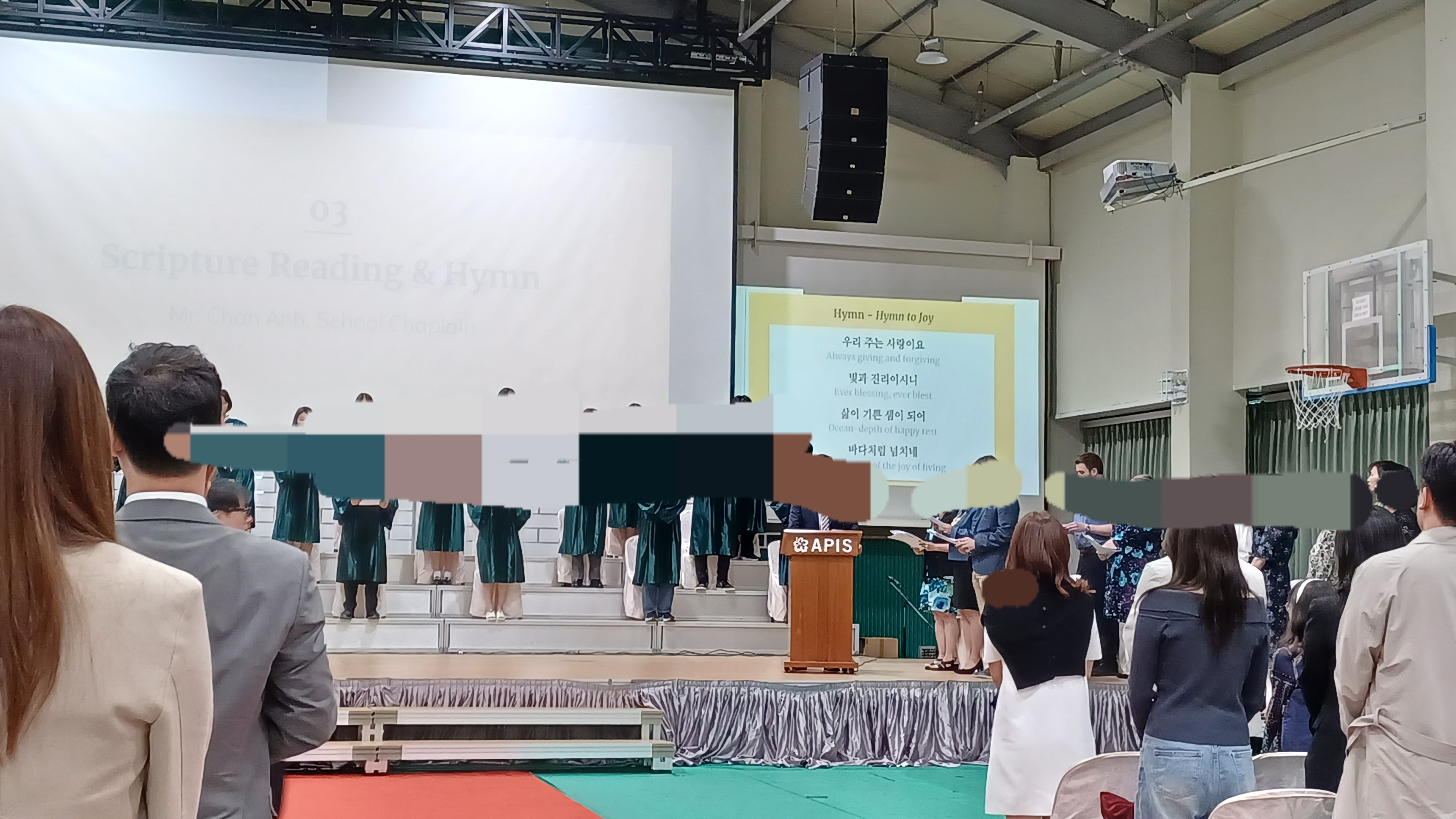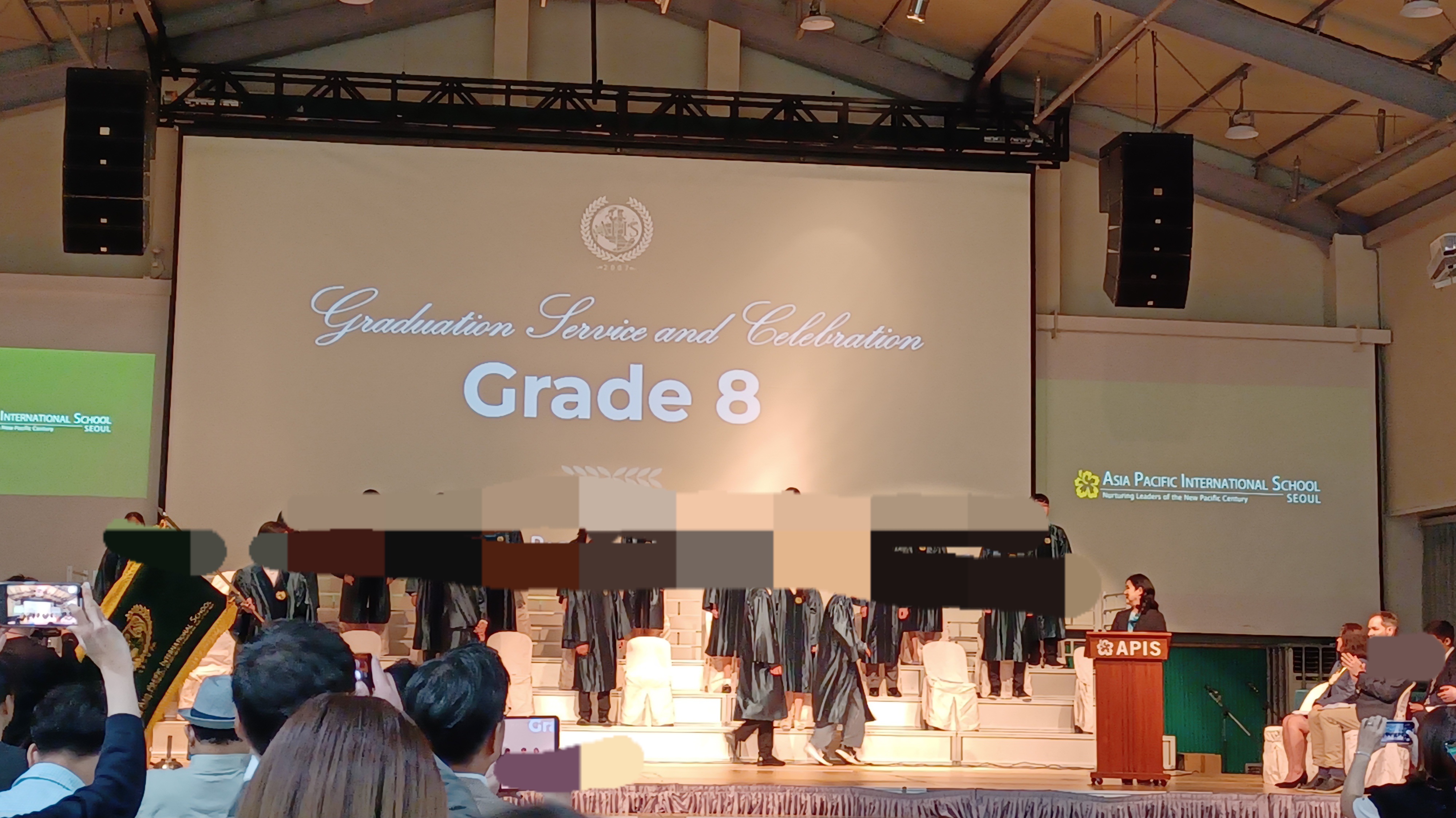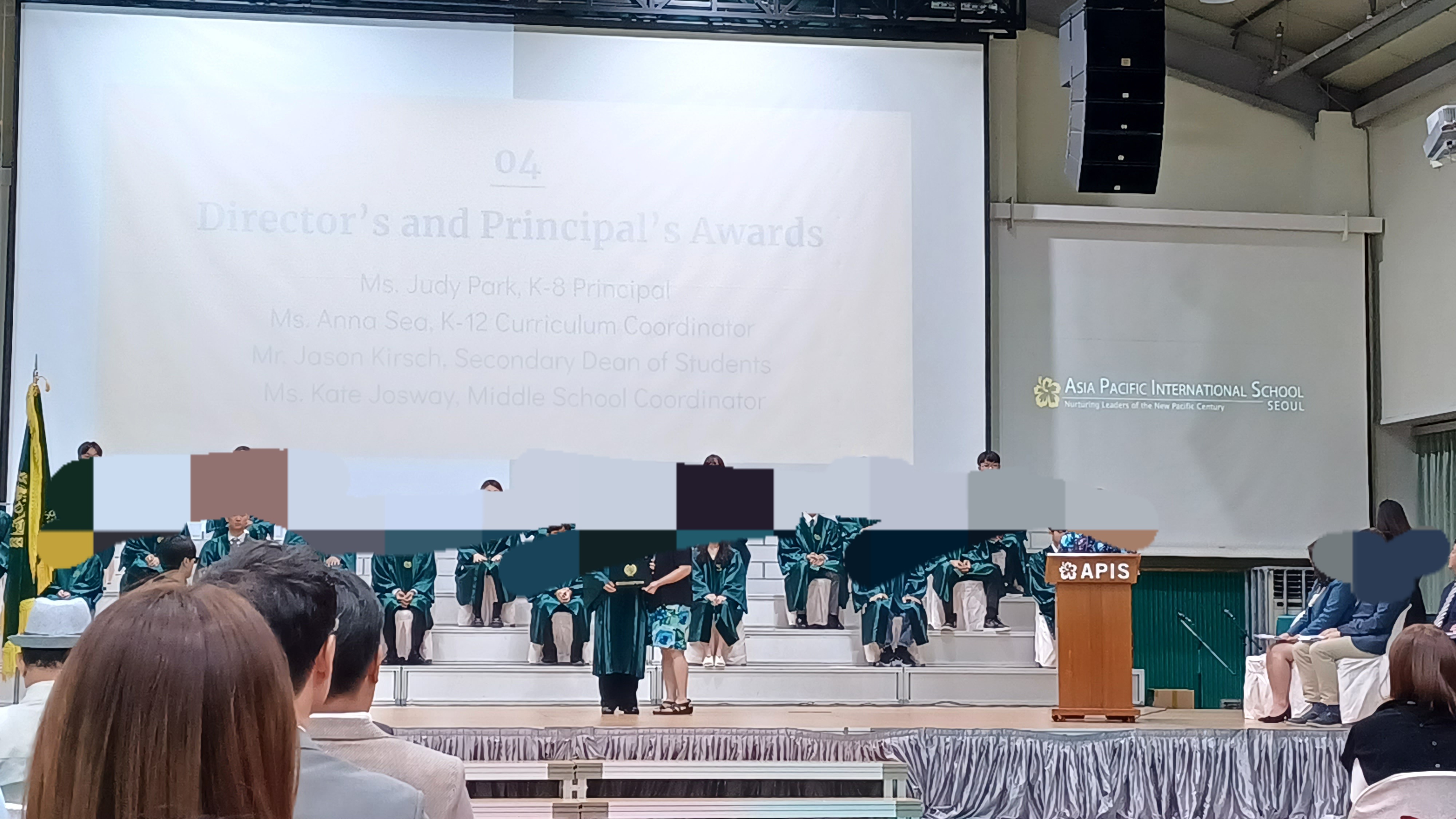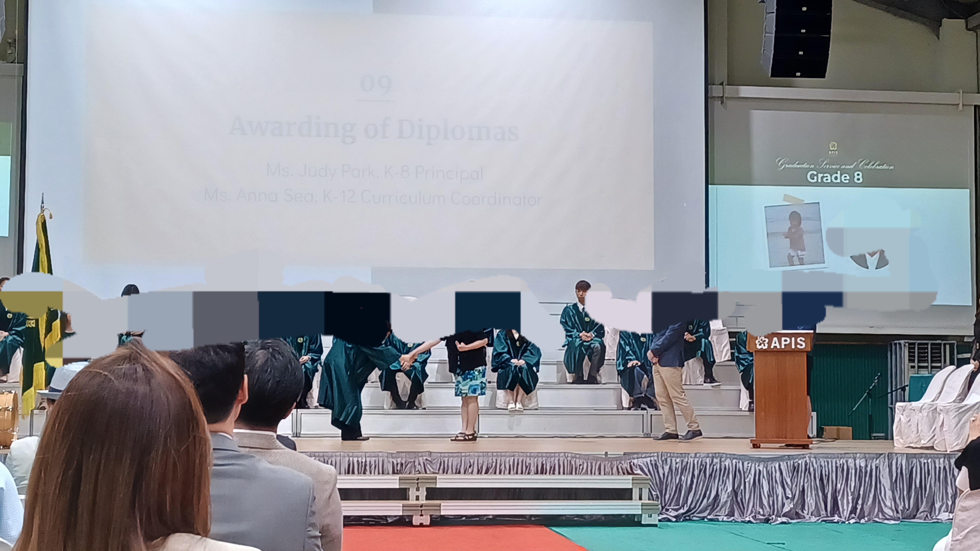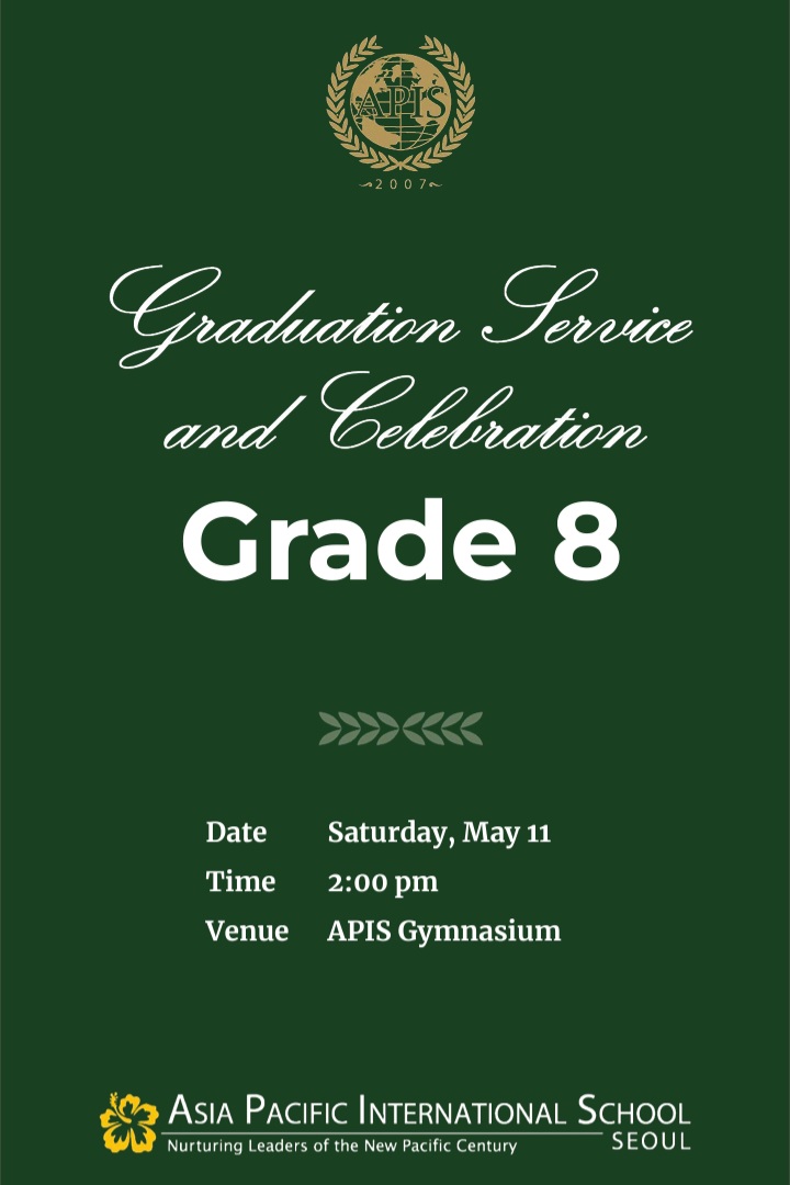 APIS 아시아퍼시픽국제외국인학교 중학교 졸업식이 있어서 참석한 후기입니다. 올해는 스무여 명의 학생들이 8학년을 졸업했습니다. 졸업식은 5층 체육관에서 열렸습니다. 졸업식은 8학년 생활을 담은 사진 슬라이드 쇼가 체육관 강당벽의 대형 스크린에서 나오는 것으로 시작했습니다. 이후 대학교 졸업식처럼 패컬티 멤버들이 레드카펫으로 입장해서 자리에 착석, 이후 졸업생들이 입장해서 무대에 준비된 자리에 앉았습니다. 이후 웰컴 메시지-기도-성경봉독 및 찬송-상장수여-선생님 말씀-졸업생의 뮤직 퍼포먼스-학생 스피치-졸업생의 뮤직 퍼포먼스-졸업장 수여-기도-학생들 퇴장으로 이어졌습니다. 포토스폿은 5층 체육관, 1층에 마련되어 있어서 자유롭게 사진촬영을 할 수 있었습니다. 이후 지하 카페테리아에 준비된 다과를 즐기고 부모님 선생님과 교류하는 시간이 있었습니다. 졸업선물로는 학교에서 아이의 이름과 학교명이 인쇄된 텀블러를, 학교 펀드 및 학부모님이 일부 비용을 부담해서 산 백팩과 이름 태그를 받았습니다.