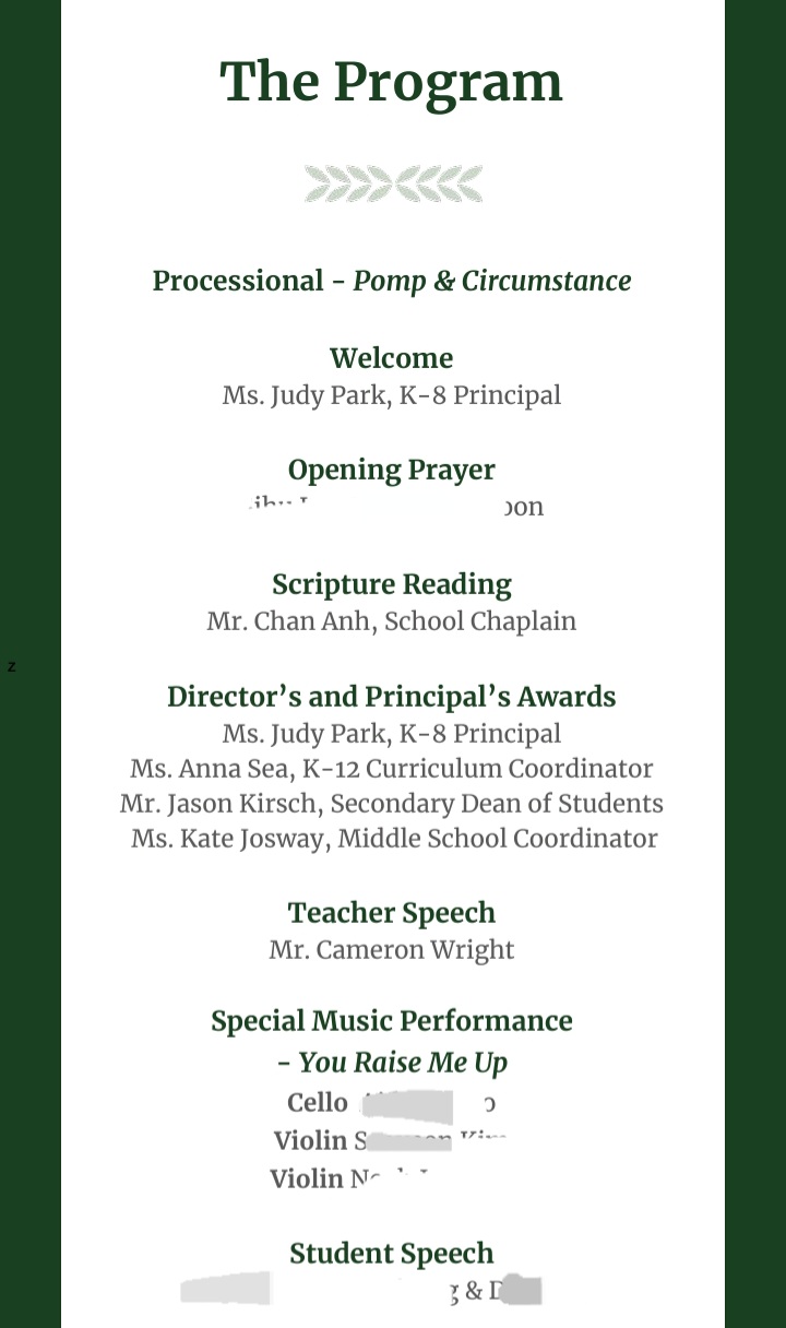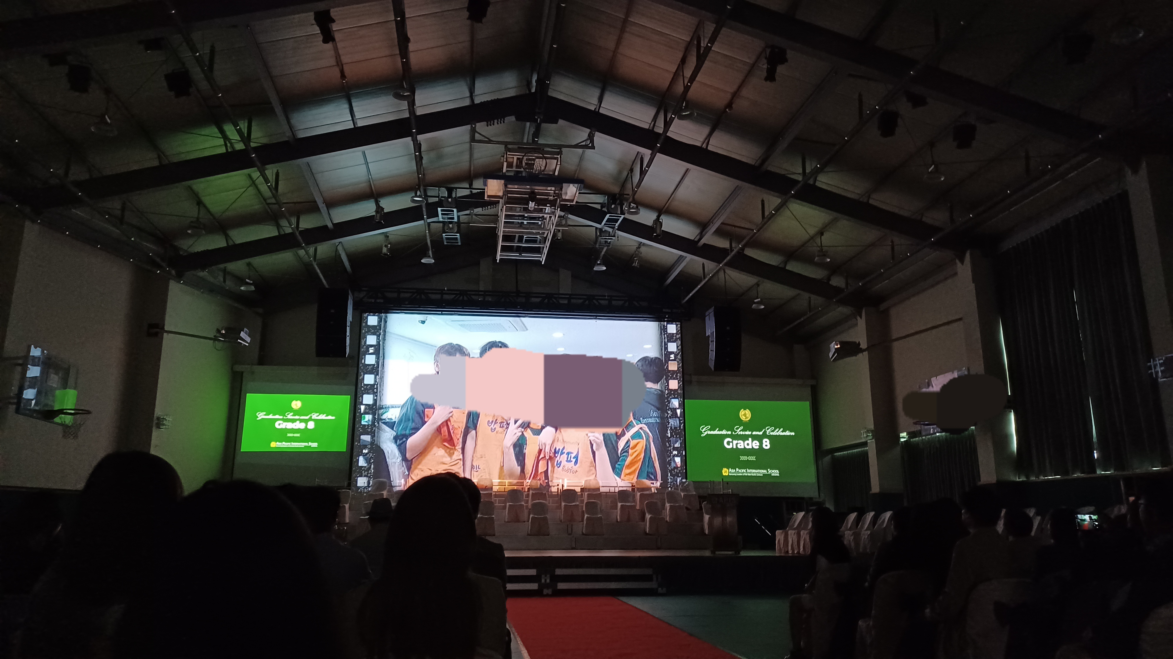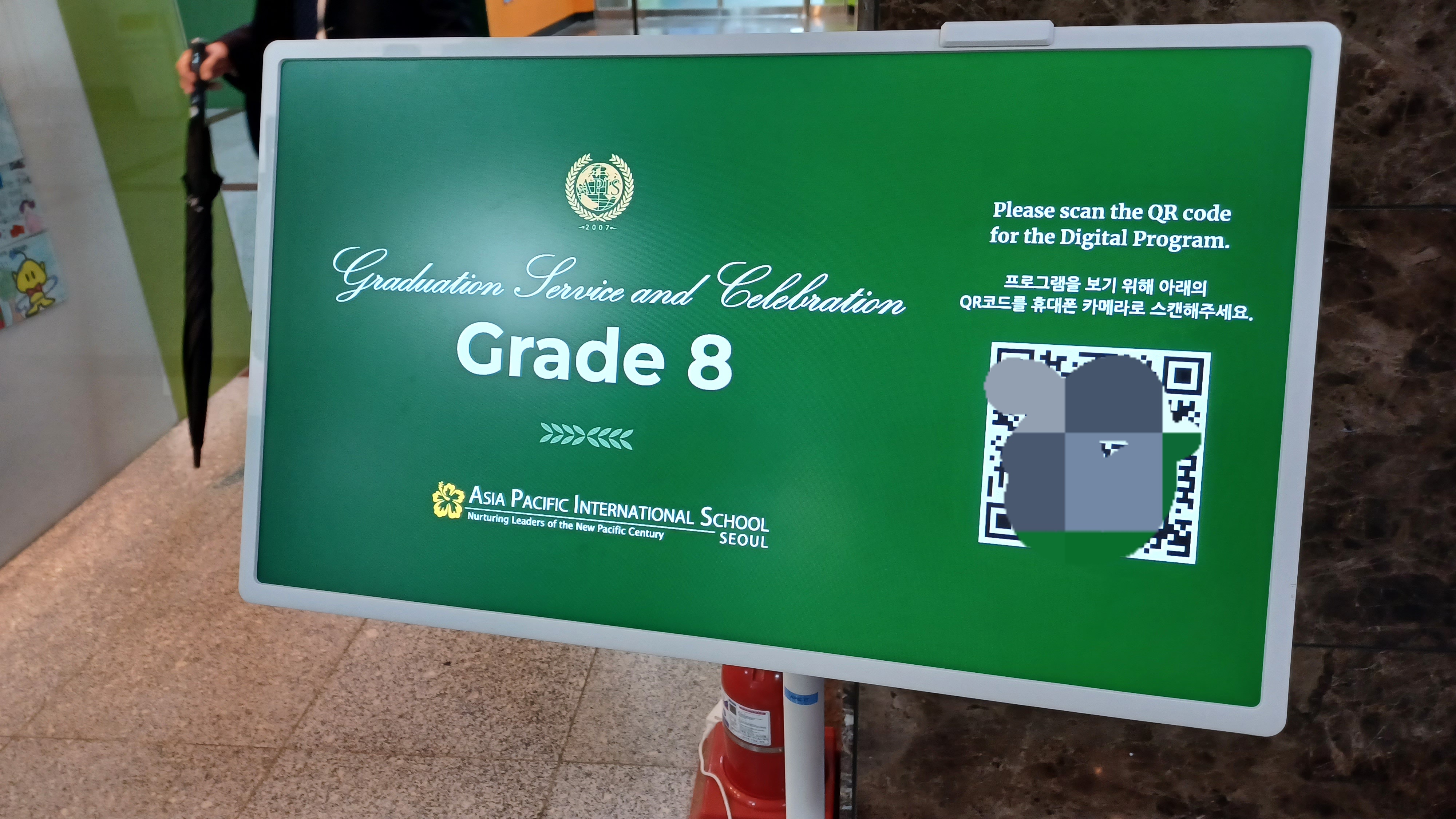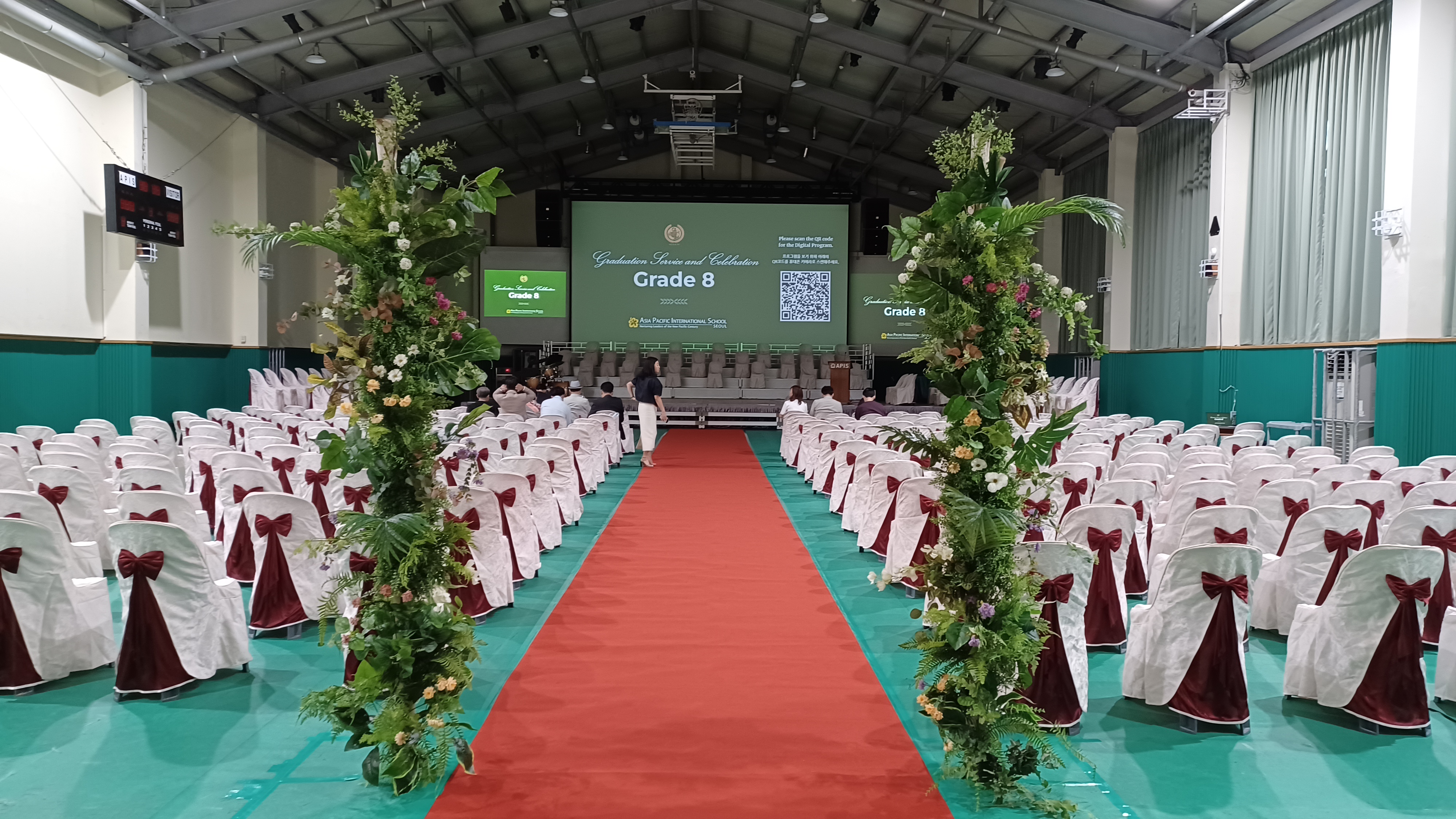 APIS 아시아퍼시픽국제외국인학교 중학교 졸업식이 있어서 참석한 후기입니다. 올해는 스무여 명의 학생들이 8학년을 졸업했습니다. 졸업식은 5층 체육관에서 열렸습니다. 졸업식은 8학년 생활을 담은 사진 슬라이드 쇼가 체육관 강당벽의 대형 스크린에서 나오는 것으로 시작했습니다. 이후 대학교 졸업식처럼 패컬티 멤버들이 레드카펫으로 입장해서 자리에 착석, 이후 졸업생들이 입장해서 무대에 준비된 자리에 앉았습니다. 이후 웰컴 메시지-기도-성경봉독 및 찬송-상장수여-선생님 말씀-졸업생의 뮤직 퍼포먼스-학생 스피치-졸업생의 뮤직 퍼포먼스-졸업장 수여-기도-학생들 퇴장으로 이어졌습니다. 포토스폿은 5층 체육관, 1층에 마련되어 있어서 자유롭게 사진촬영을 할 수 있었습니다. 이후 지하 카페테리아에 준비된 다과를 즐기고 부모님 선생님과 교류하는 시간이 있었습니다. 졸업선물로는 학교에서 아이의 이름과 학교명이 인쇄된 텀블러를, 학교 펀드 및 학부모님이 일부 비용을 부담해서 산 백팩과 이름 태그를 받았습니다.