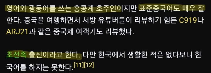 나무위키에 따르면 항공 전문 유튜버 샘 추이 Sam Chui가 조선족이라고 한다. 영어로 그가 조선족이라는 것을 아직 찾지 못해서 진짜인지는 모르겠다. 나는 그를 보면서 중국계 미국/캐나다 교포 같다는 생각을 했었는데 그에게 한민족 DNA가 있다는 정보는 전혀 예상 못해서 충격적이었다.
