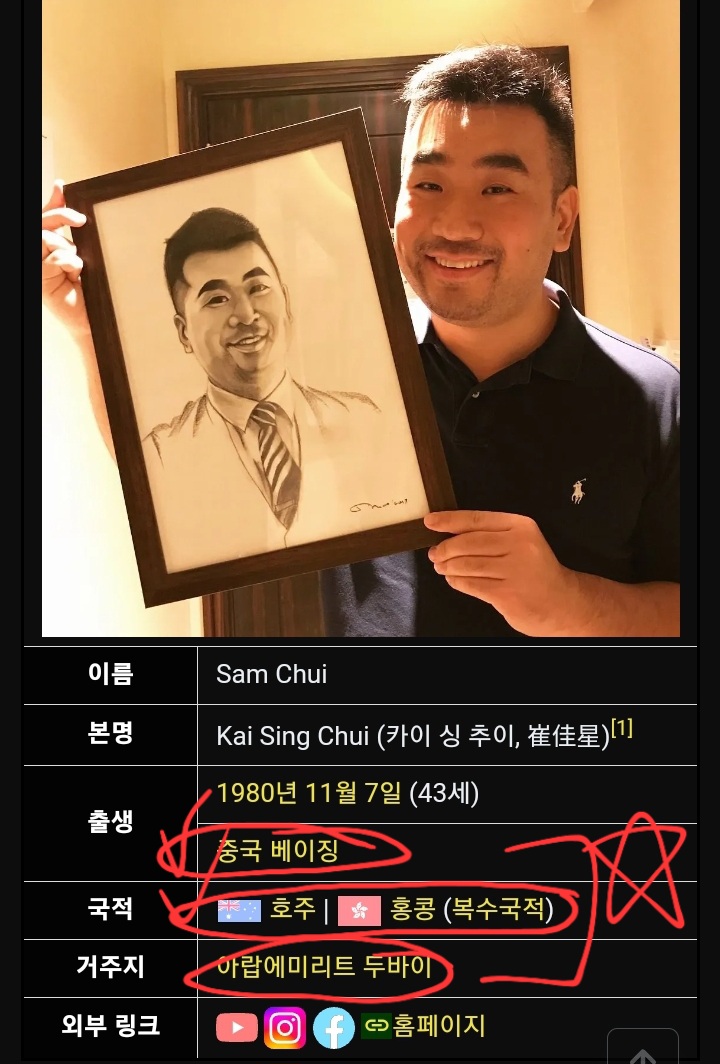 샘 추이는 중국 베이징에서 출생했고, 현재 나무위키 국적란에 오스트레일리아, 홍콩이라 적혀있다.