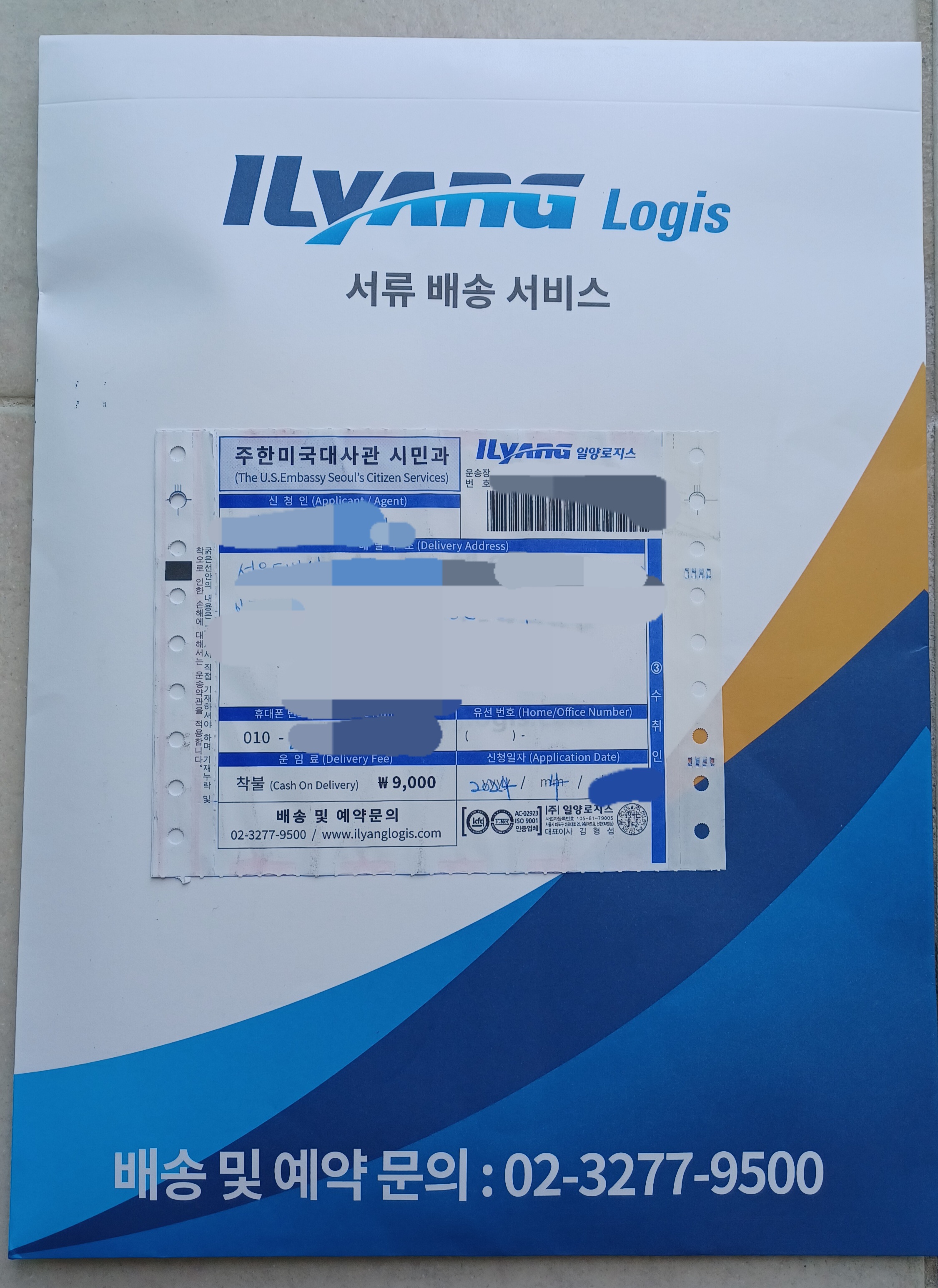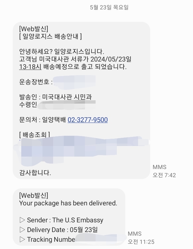 새벽 일양택배에서 당일 12-18시 사이에 여권 배달이 온다는 문자를 받았고, 아침 중에 일양택배 기사가 오후 12시쯤에 "미국비자"를 가져온다고 전화했습니다.