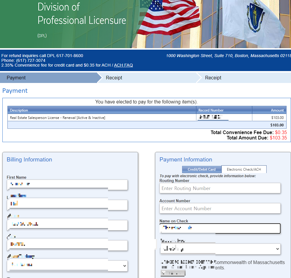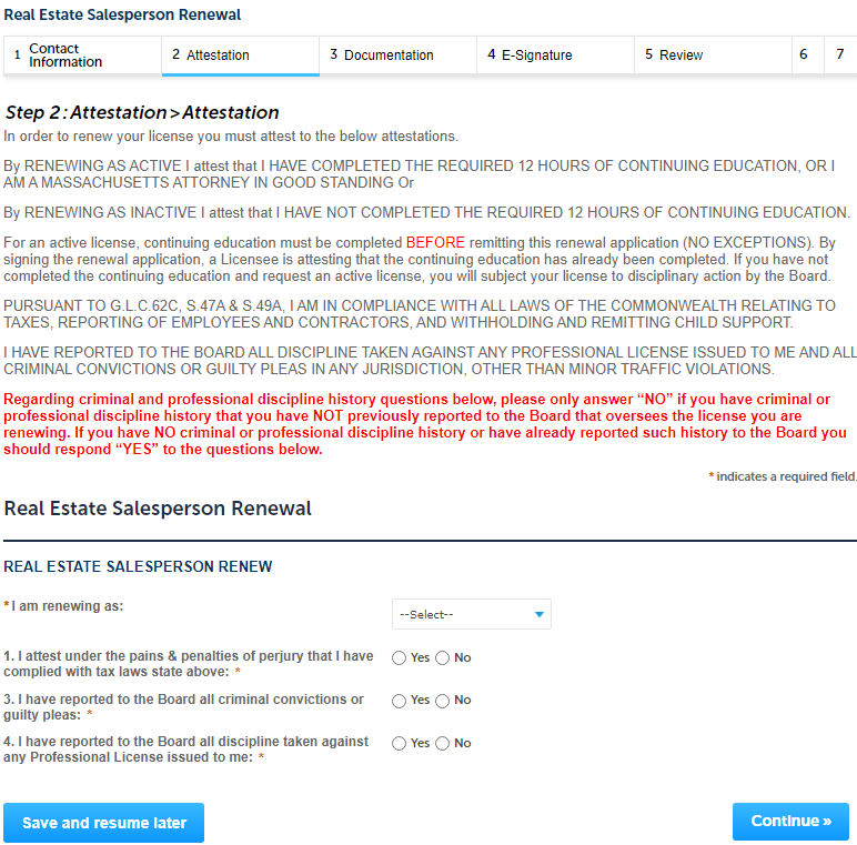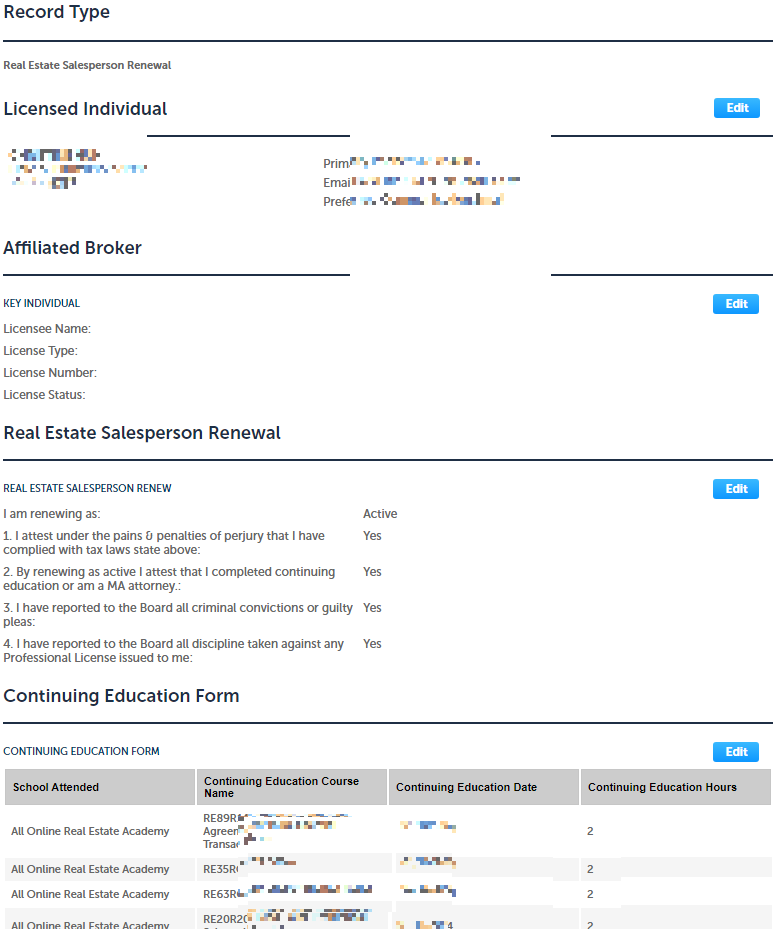 저는 미국 매사추세츠 주의 부동산 중개사 Massachusetts Real Estate Salesperson 자격증을 가지고 있습니다. 이 자격증은 매 2년마다 12시간의 보수교육(컨티뉴잉 에듀케이션)을 받고 라이선스를 갱신해야 합니다. 매사추세츠 주는 자격증 관리 관련 업무를 다 온라인으로 하고 있습니다. 제가 진행한 순서를 정리해 봤습니다.