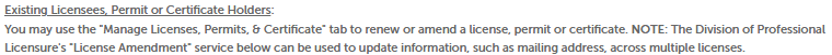 "Existing Licensees, Permit or Certificate Holders"를 클릭합니다.