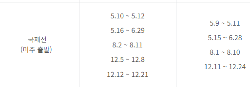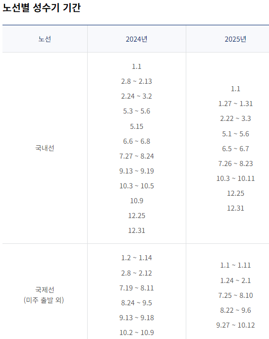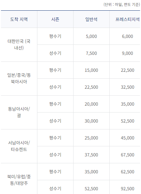 비수기와 성수기 때 공제되는 마일리지가 다른데, 각 구간별로 성수기 기간이 다릅니다.