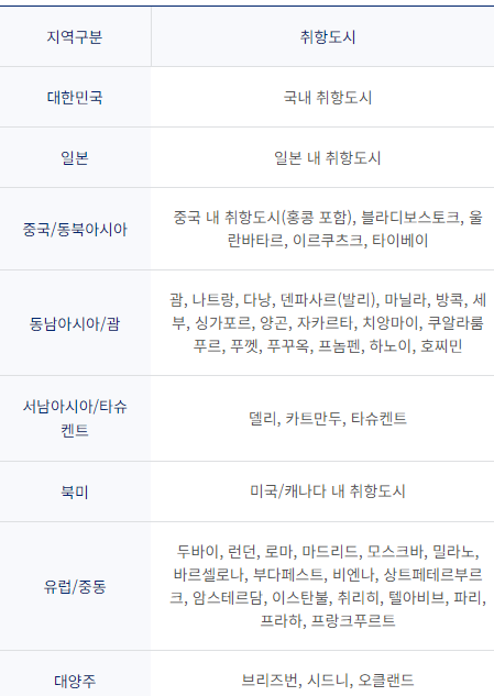 각 구간별 자세한 취항지 이름은 다음과 같습니다.
