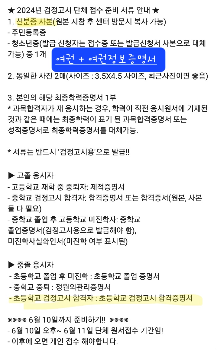 저의 아이들은 외국인학교에 다니고 있습니다. 한국어 공부 겸 보험용으로 아이들에게 한국 학력 검정고시를 보게 하고 있습니다. 그래서 올해 한국학교 기준 중학교 2학년일 첫째는 지난 5월에 고등학교 졸업 검정고시에 합격했고 초등학년 6학년에 해당하는 둘째는 초등학교 졸업 검정고시 시험에 합격했습니다. 오는 팔월에는 둘째 아이에게 중학교 검정고시를 보게 할 예정입니다. 몇 달 전에 저희 집에서 가까운 꿈드림이라는 학교밖 청소년 시설에 아이들을 등록을 시켰었는데, 이곳에서 검정고시 수험접수를 한다고 공지가 나왔습니다. 제가 직접 오프라인으로 검정고시 시험 접수장인 서울공고까지 가서 수험지원을 하면 거의 반나절은 걸립니다. 그래서 이번에는 처음으로 꿈드림 센터에서 검정고시 수험접수를 하기로 했습니다. 저는 아이의 여권과 여권정보확인서(구청 여권민원과에서 발급받음. 1000원), 아이의 초등학교 졸업 검정고시 합격증서(주민센터에서 발급받음. 1000원), 그리고 3.5 ×4.5 cm 사이즈 사진 두 장을 가지고 꿈드림에 갔습니다. 검정고시 접수하는 선생님이 계셨고 상담실 하나에 초졸, 중졸, 고졸 검정고시 응시 원서를 구비해 놓았습니다. 저는 중졸 검정고시 원서를 작성하고 아이 사진도 붙이고, 해당 서류를 담당 선생님께 드렸습니다. 선생님께서는 여권은 복사해서 돌려주시고 나머지는 다 가져가셨습니다. 이렇게 센터에서 접수한 원서를 서울시 교육청에 보내고 시험접수 프로세스가 완전히 끝나면 수험서가 다시 꿈드림에 도착한다고 합니다. 수험서가 꿈드림 센터에 도착하면 연락 준다고 하니 기다리고 있습니다.