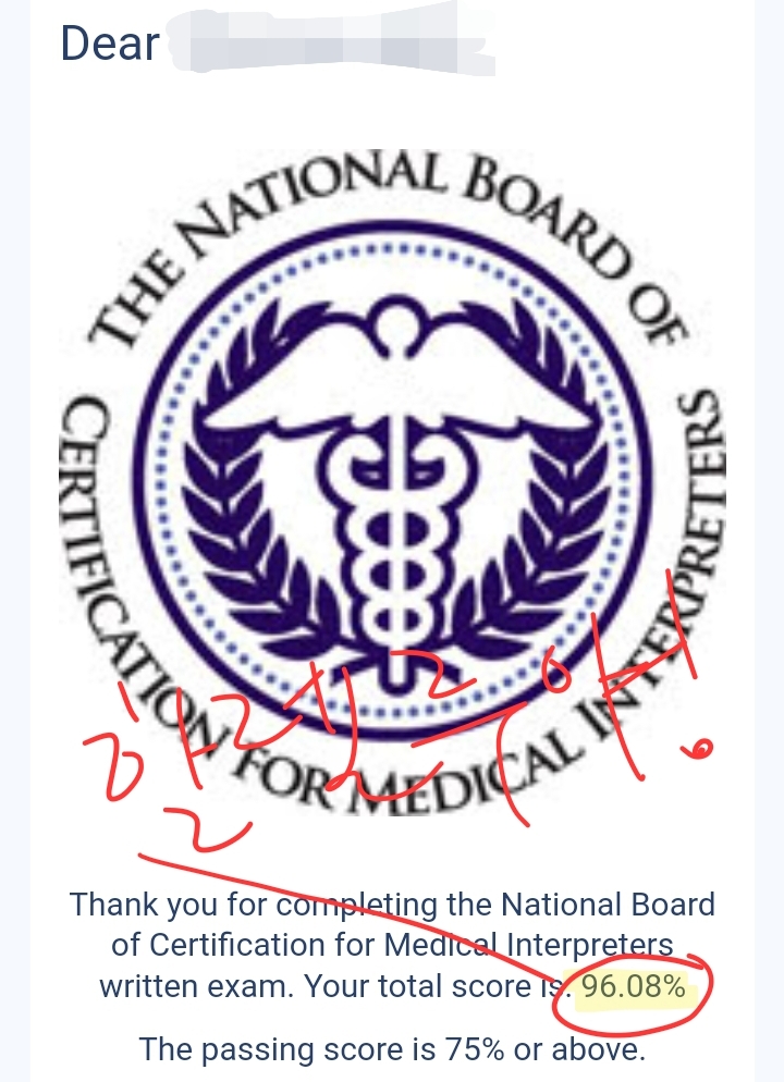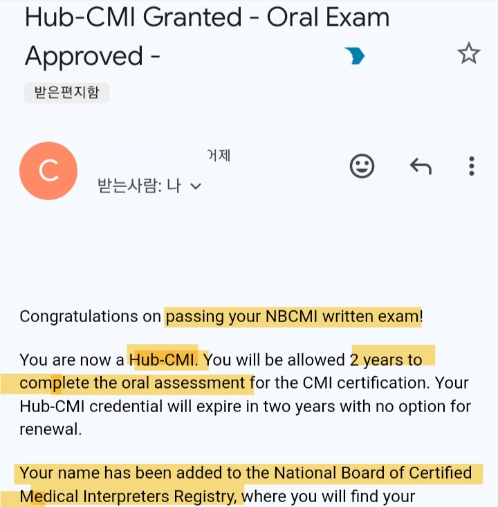12시간 정도 후에는 나의 어드바이저가 내가 필기시험에 통과해서 HUB-CMI, 2년 안에 구술시험을 패스해야 한다는 이메일을 보냈다. NBCMI 홈페이지의 내 Status도 hub-cmi로 바뀌었다. #통역사 #한영통역 #의학지직 #주부부업 #중년공부 #자기개발 #자기계발