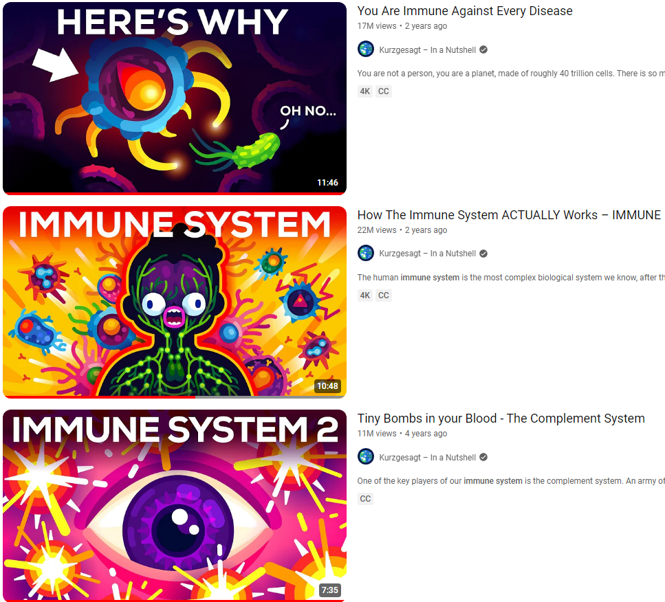 면역계는 위에서 언급한 유튜브 영상으로는 이해 및 암기가 너무 힘들어서 유튜브 영상을 더 찾아보다가 Kurzgesagt in a Nutshell이라는 엄청난 유튜브 채널을 찾았습니다.