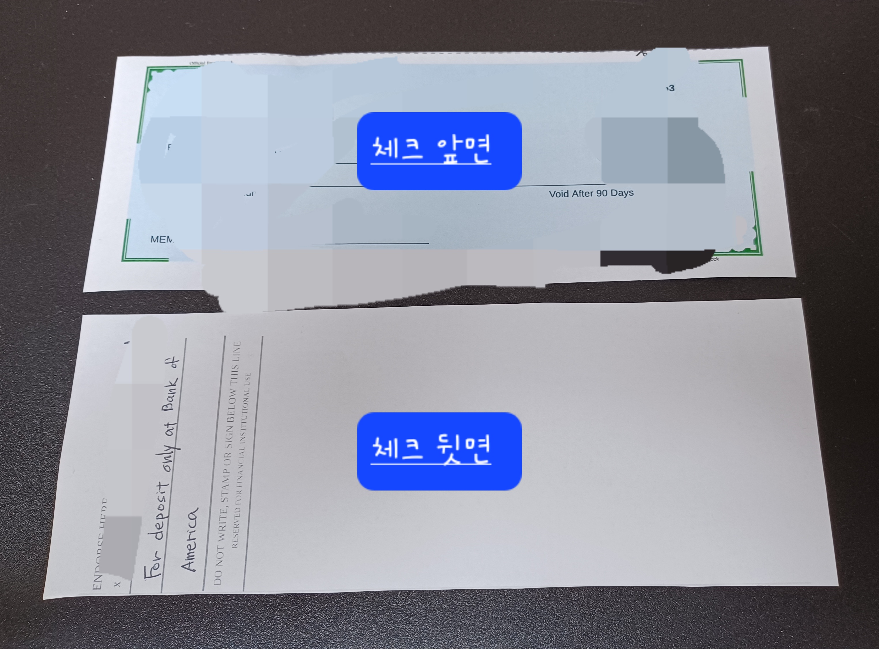 체크 앞면과 뒷면입니다. 뒷면에 상단에 줄 그어진 곳에는 본인 사인을 하고 "For deposit only at Bank of America"라 정자로 씁니다.