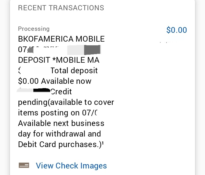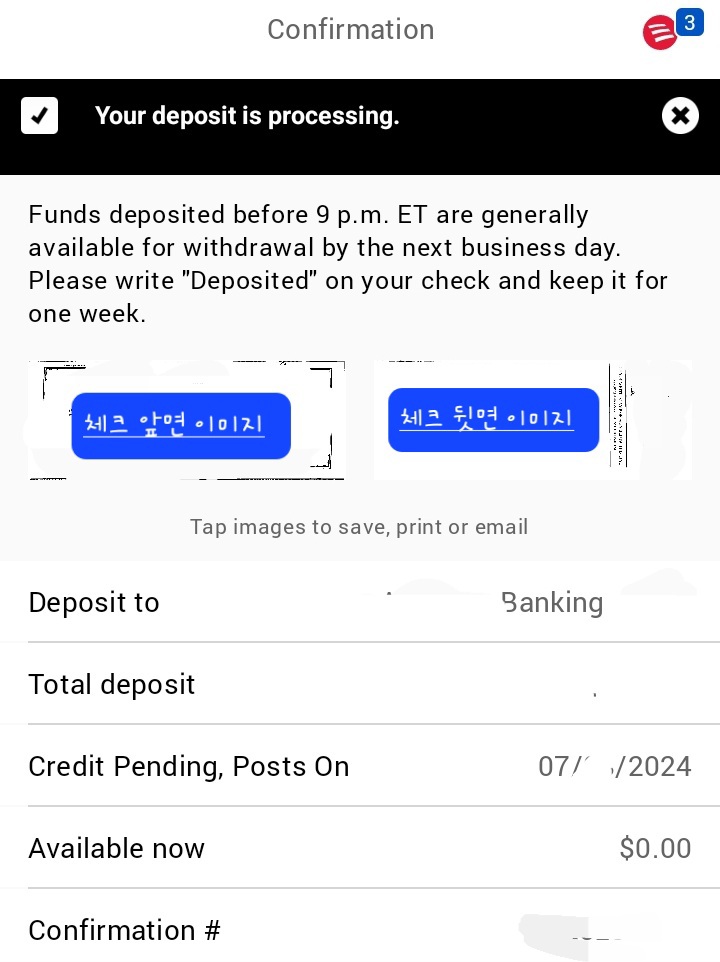 입금계좌의 입출금 내역을 보니 체크 디파짓이 진행 중이라고 나옵니다. 별 문제없으면 하루 이틀이면 디파짓이 완료되어서 입금금액이 뜹니다.