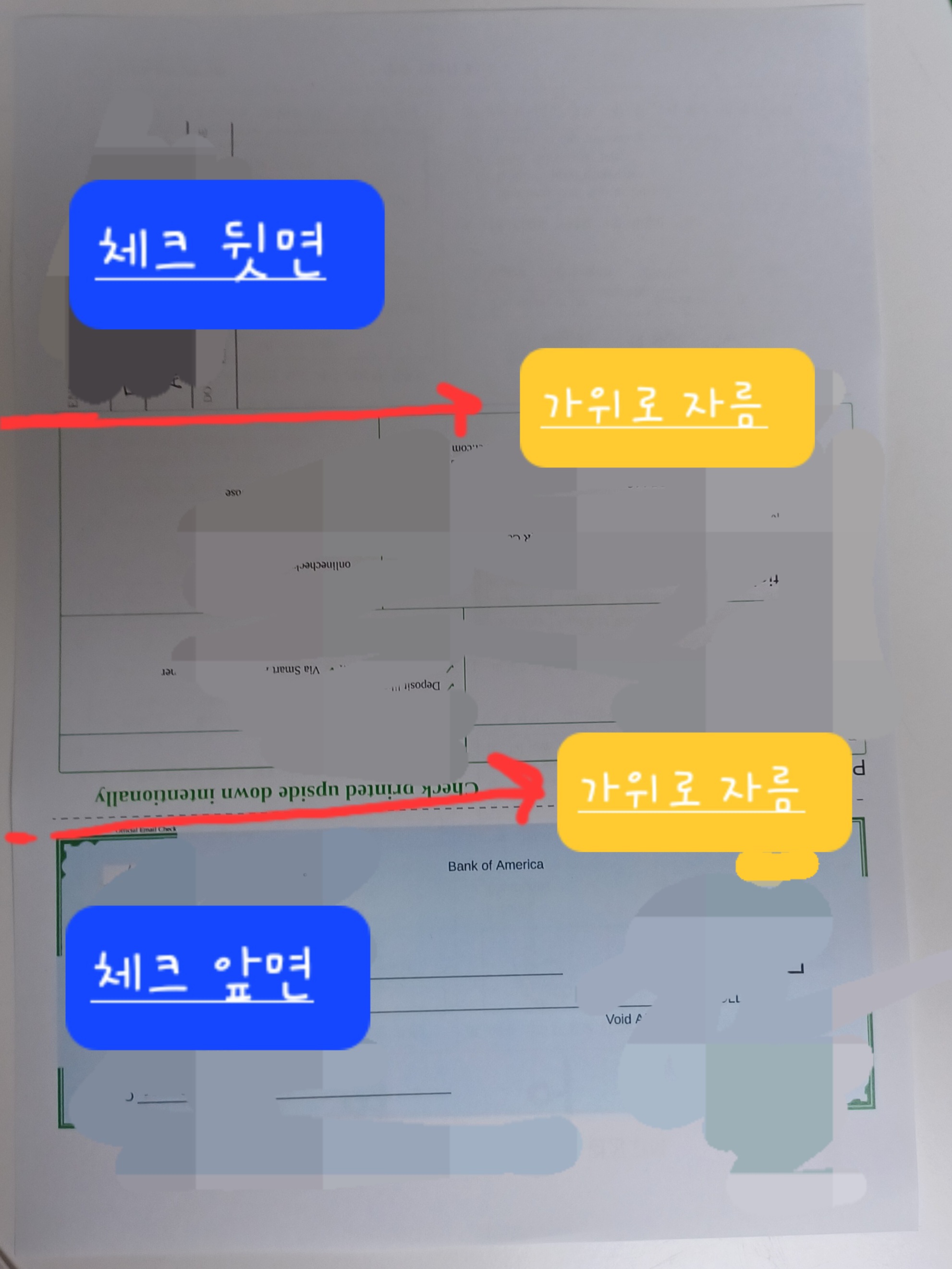 체크 pdf를 프린터로 인쇄했습니다. 문서는 레터사이즈니까 A4용지에 크기 맞게 사이즈를 조정해서 프린트합니다. 체크 앞면, 가운데 안내문(?), 체크 뒷면이 한 페이지에 표시되어 있습니다. 여기서 자르라는 점선을 따라 자르고 체크 크기에 맞게 대략 잘라줍니다.