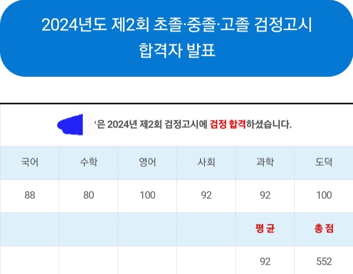 https://service.sen.go.kr/exam/jumsuCheck.jsp#n 지난 8월 8일에 실시된 2024년 제2차 초졸, 중졸, 고졸 검정고시 합격자 발표가 나왔습니다. 해당 링크로 들어가서 수험생 이름과 주민등록번호를 넣으면 시험 결과를 볼 수 있습니다. 저희 아이는 한국 학제 기준으로 초등학교 6학년이고 현재는 수도권의 외국인학교 중학교 과정에 있습니다. 기출문제 풀 때는 사회의 국사 부분이 많이 어려워서 걱정했는데, 이번해는 문제가 쉬웠는지 90점이 넘었습다.