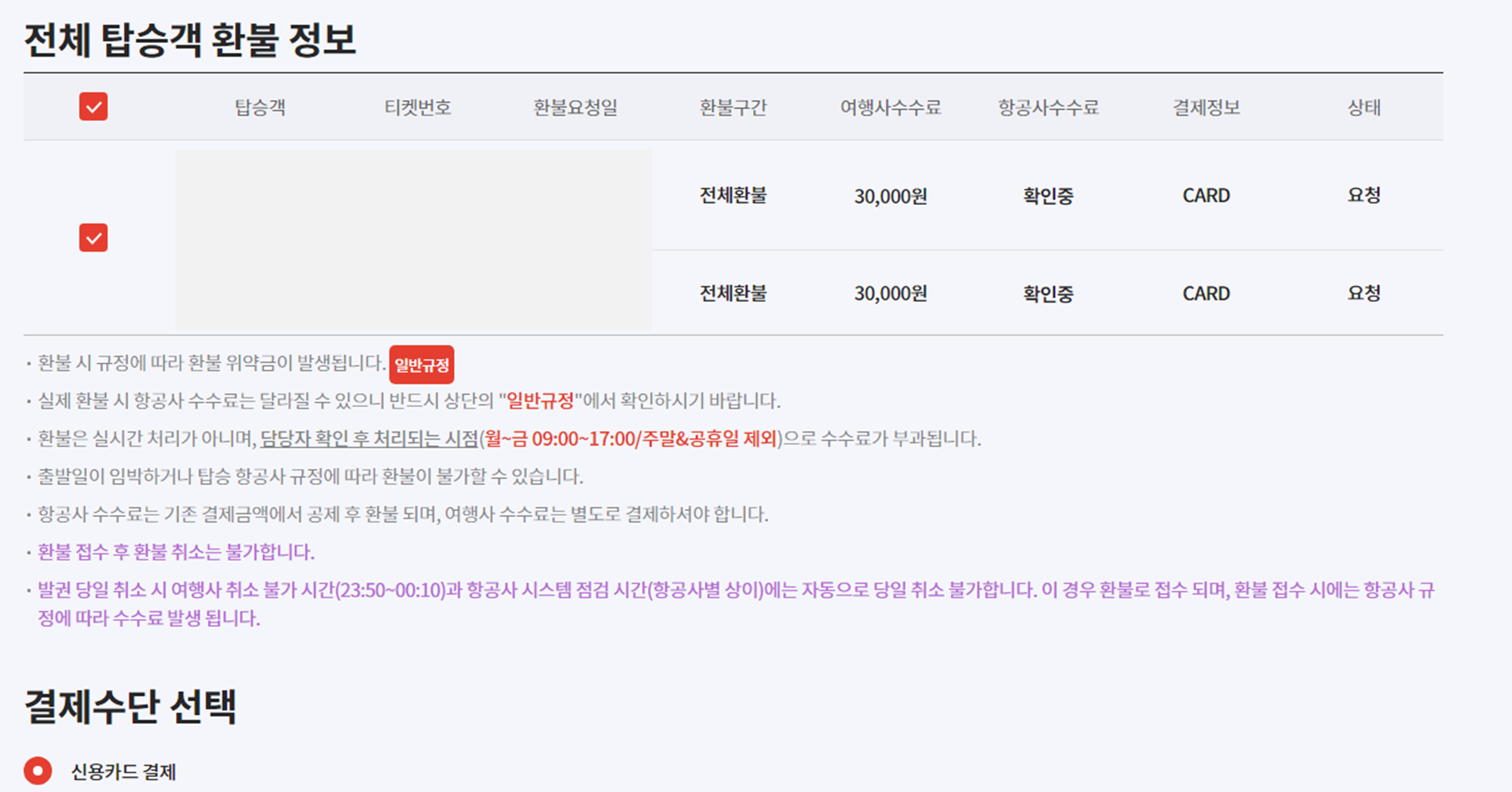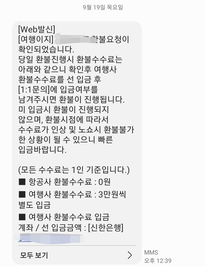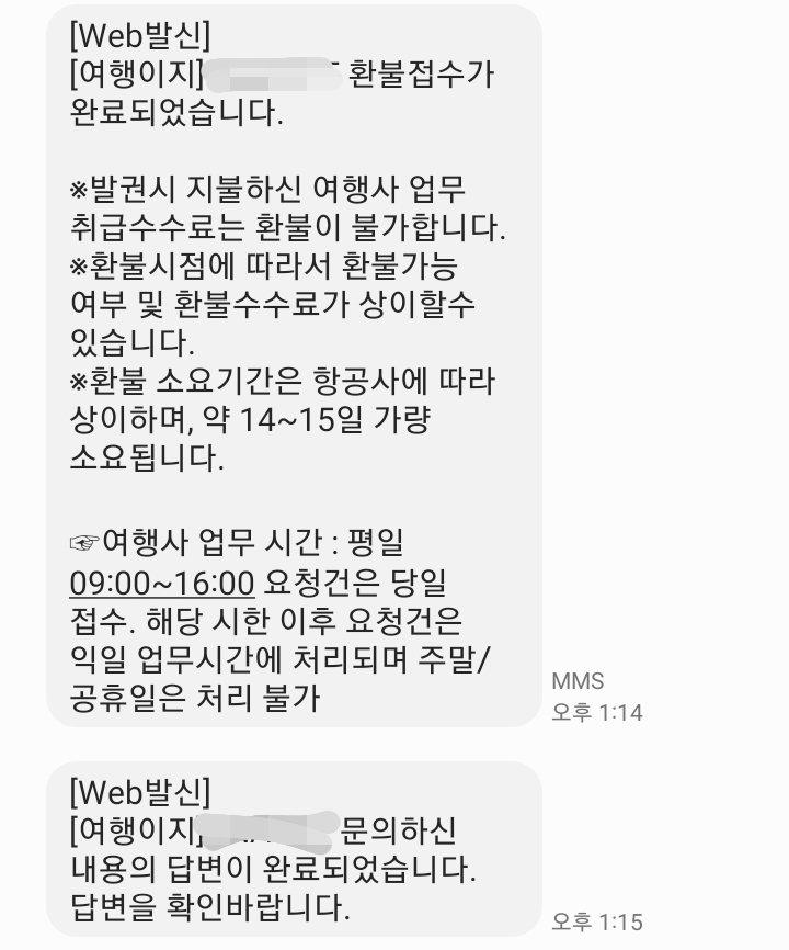 이번 겨울에 미국에 다녀와야 해서 몇 달 전에 교원투어의 여행이지라는 여행사 홈페이지를 통해 항공권을 예매했습니다. (네이버 검색으로 가장 싼 가격으로 검색됨) 그런데 충격적스럽게 애들 겨울방학 기간을 오해해서 애들 학교 개학일 이후 후 한국에 돌아오는 것으로 항공권을 예매한 것입니다. 가뜩이나 지금 비행기표를 검색해 보니 제가 비행기표를 예매했던 두 달 전보다 훨씬 비행기표가 싼 상태입니다. 그래서 비행기 표 일정을 변경하기보다는 아예 환불을 요청하기로 결정했습니다. 오늘 불과 두 시간 안에 진행된 환불 절차를 기록합니다. 이메일로 받은 항공권 발권 페이지로 들어가서 환불 요청 버튼을 클릭했습니다. 각종 정책에 동의한다는 질문에 동의한다고 체크를 하니 전체 탑승객 환불 정보가 나왔습니다. 다행히 제가 예약한 항공권은 출발일이 3개월 이상 남아 있어서 여행사 수수료 삼만 원만 나왔고 항공사 수수료는 발생하지 않았습니다. 제가 해당 웹사이트에 회원 등록할 때 등록한 핸드폰으로 여행사 수수료를 입금하라는 문자가 와서 입금을 했습니다. 이후 1:1 문의로 환불수수료를 입금했다는 글을 올리라고 했는데, 제가 글을 올리기도 전에 환불 접수가 완료되었다는 문자가 왔습니다. 다만 항공료 환불은 14-15일 정도 소요가 된다고 하니 기다렸습니다. 그리고 불과 이틀 후에 국민카드사에서 환불이 완료되었다는 문자가 왔습니다. 결론적으로 교원투어 여행이지에서 진행된 항공권 취소 환불절차는 빠르게 이루어져서 만족했습니다.