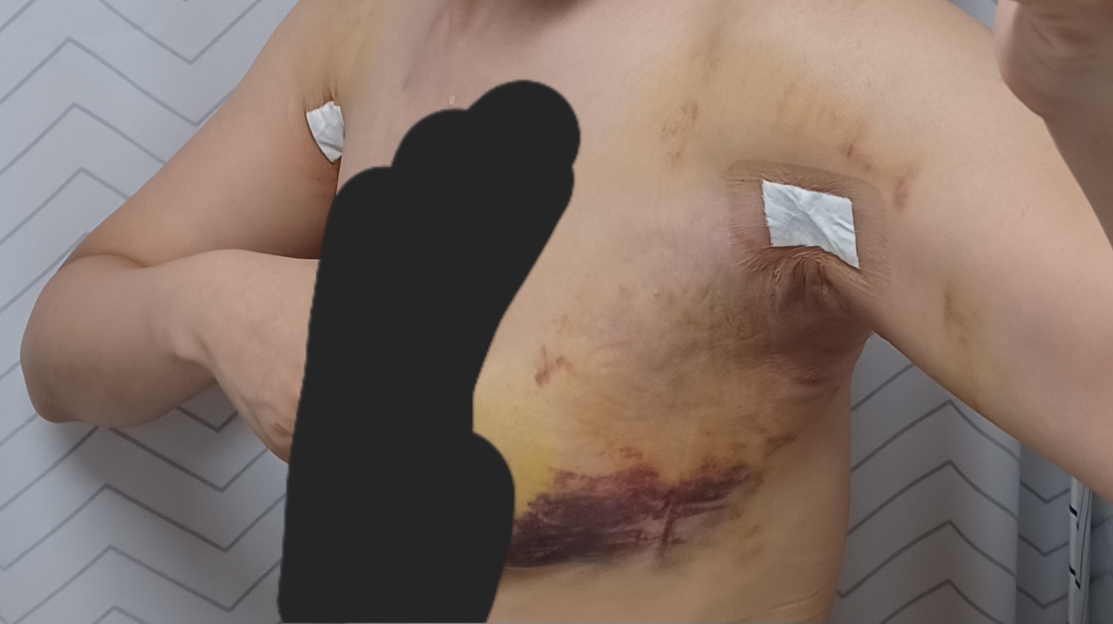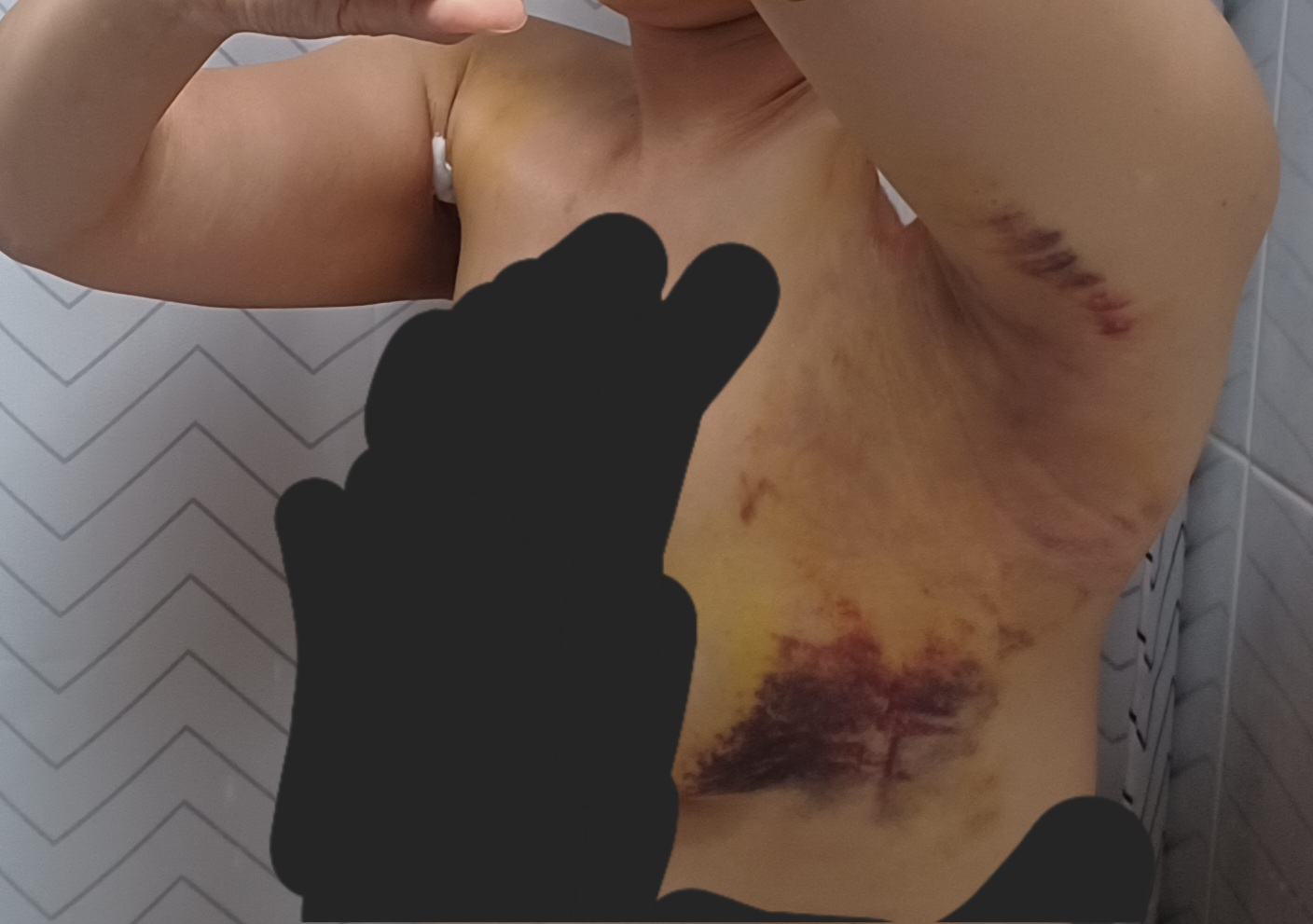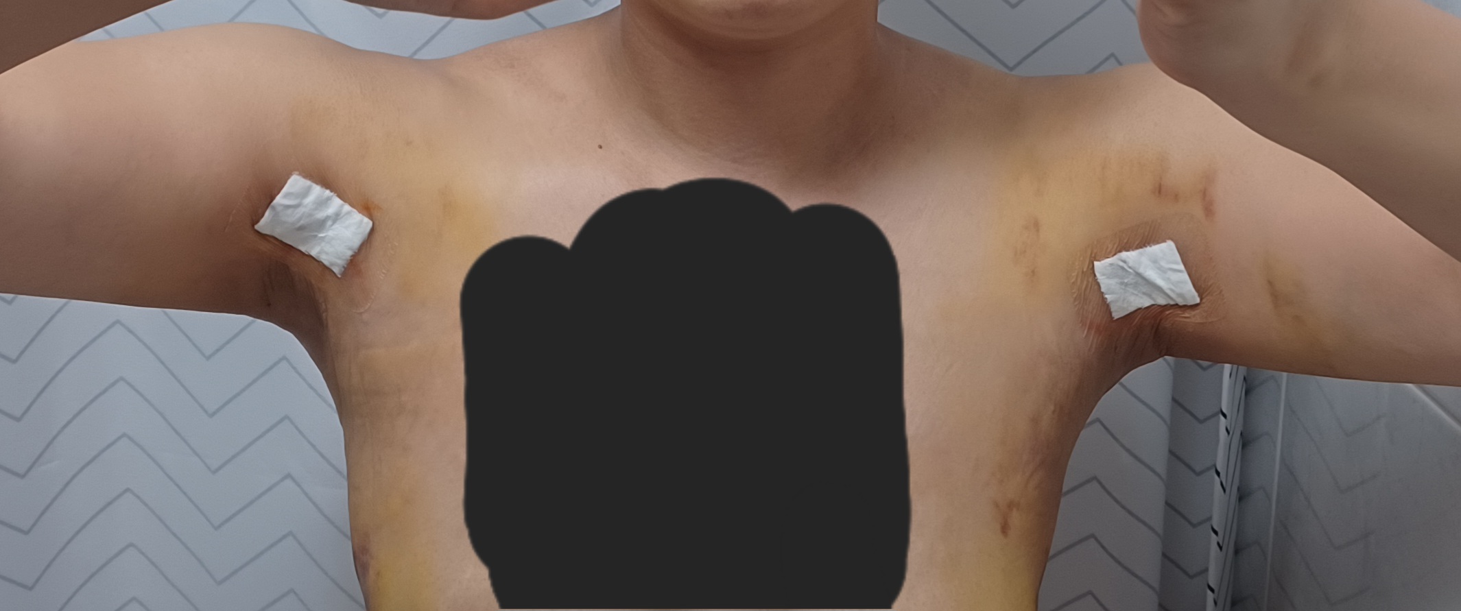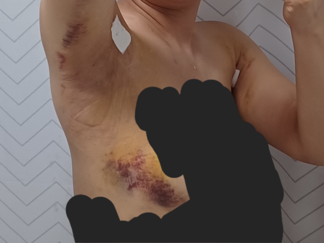 부유방 제거 수술 후 5일차이다. 팔쪽 멍은 많이 없어지고 가슴쪽에 멍이 고였다. 머리는 감을 수 있고 머리 묶기는 아직 좀 버겁다. 몸을 뒤트는 자세도 좀 불편하다. 압박복과 압박대로 조이는 부분이 간지러워서 조금씩 긁는다.