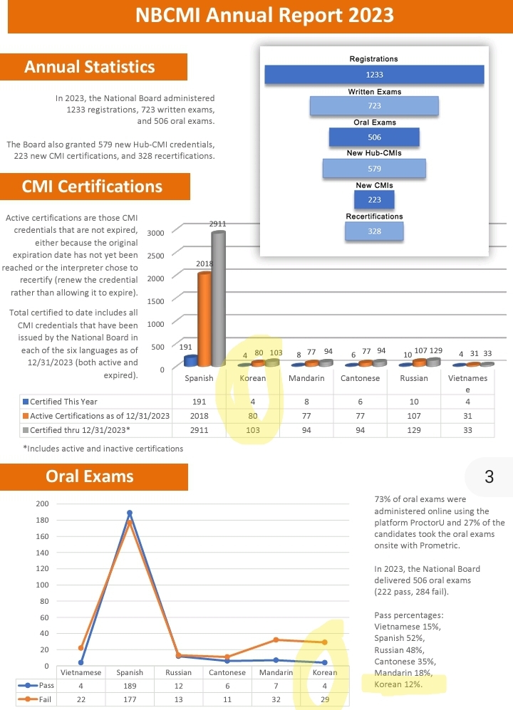 NBCMI 2023년 리포트를 보니 작년에 한국어 통역사 자격증 시험에 최종 합격 사람은 단 4명으로 필기시험 합격자 대비 12퍼센트의 매우 낮은 합격률을 보였다. 이 단체에서 시험보는 언어(베트남어, 스페인어, 러시아어, 광동어, 중국 보통화, 한국어) 중에서 가장 낮은 것이다. 그 전 년도에서는 30-40프로는 되었는데 왜 갑자기 합격률이 낮아졌는지 모르겠다. NBCMI가 과거부터 지금까지 한국어 통역사 자격증을 발급해준 사람 총 103명 중 자격증이 유효한 사람은 80명에 불과하다.